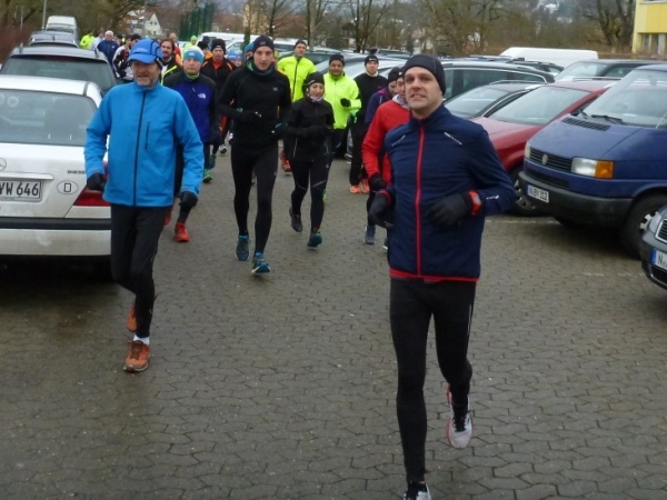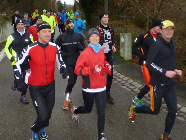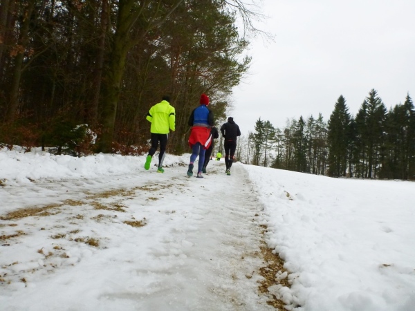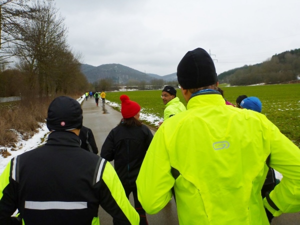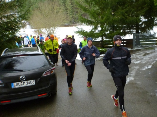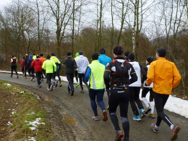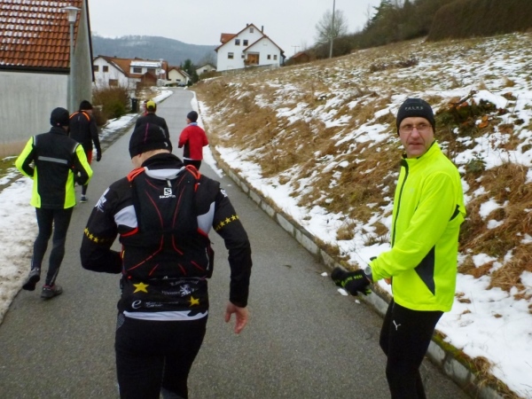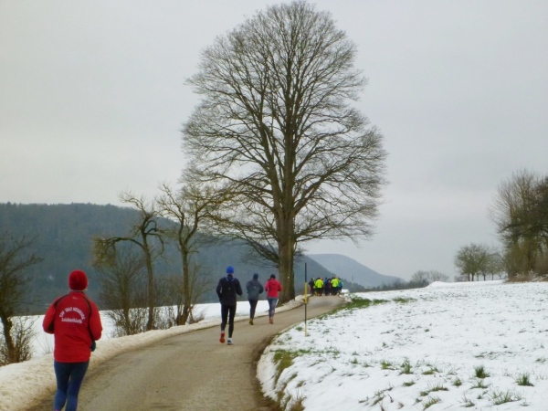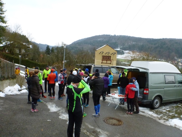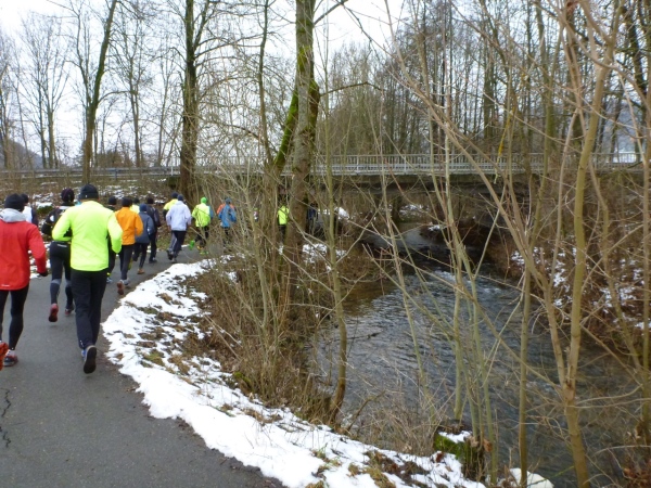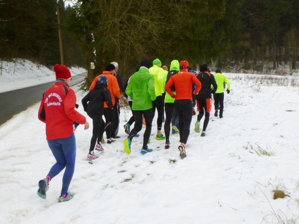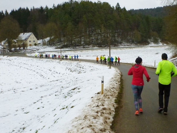 Wer seinen Tee hier „aufmotzen“ will, der bekommt einen Schuss Rum ins Getränk. Auch der letzte Rest Glühwein von Weihnachten wird an den Mann bzw. Frau gebracht. Nach sieben Minuten Pause ziehen die Ausdauernden (schätzungsweise 40) weiter bis zum Talboden. Das Tempo wird jetzt ein wenig gesteigert, rund 5.30 Minuten je Kilometer. Die Endbeschleunigung gab es bei meinen Teilnahmen immer. Doch heute bleibt das Feld zusammen, noch.