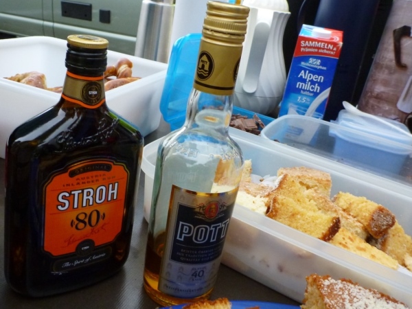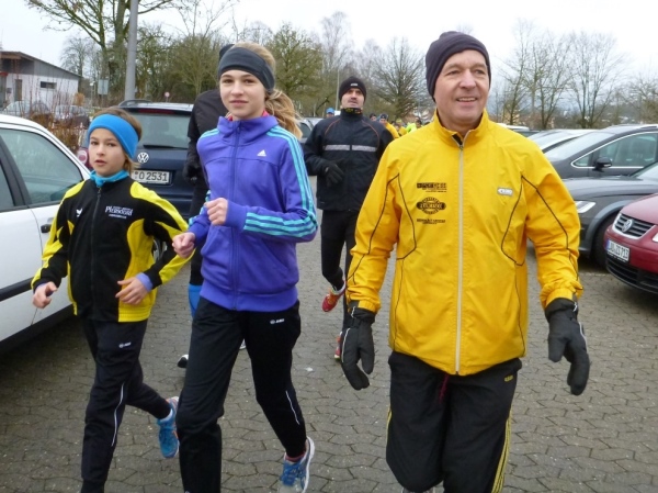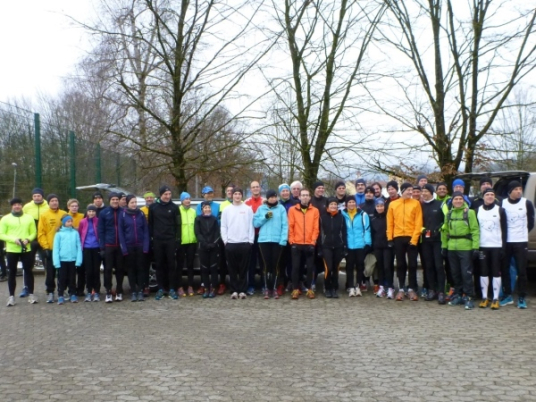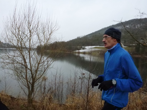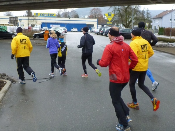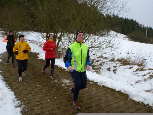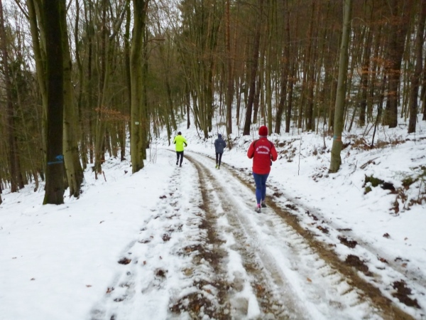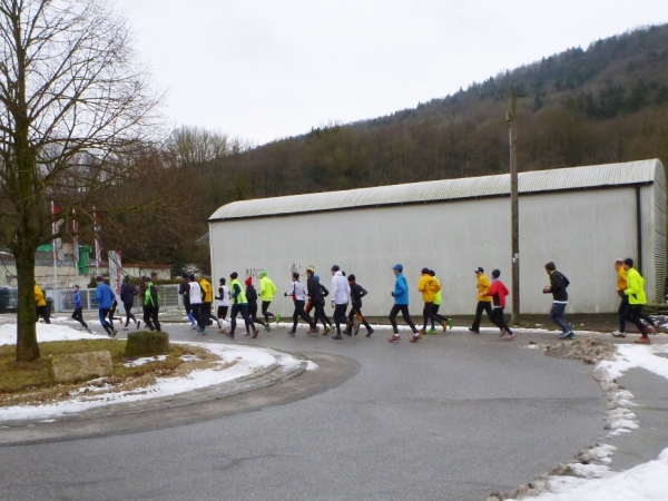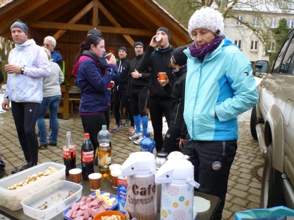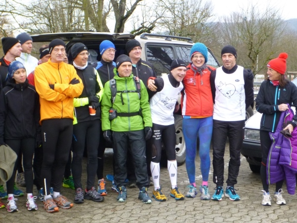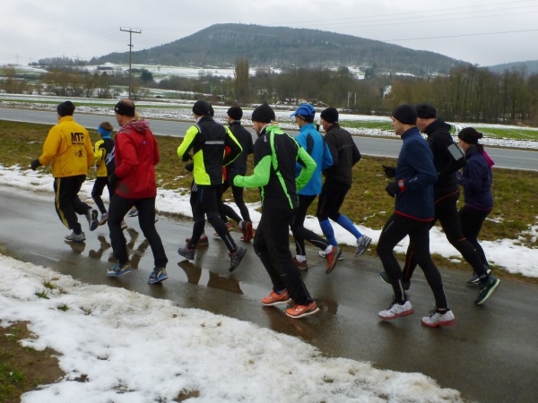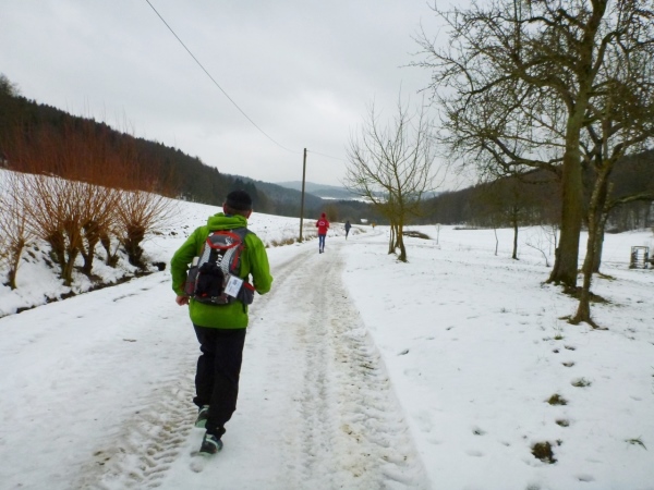 Wer seinen Tee hier „aufmotzen“ will, der bekommt einen Schuss Rum ins Getränk. Auch der letzte Rest Glühwein von Weihnachten wird an den Mann bzw. Frau gebracht. Nach sieben Minuten Pause ziehen die Ausdauernden (schätzungsweise 40) weiter bis zum Talboden. Das Tempo wird jetzt ein wenig gesteigert, rund 5.30 Minuten je Kilometer. Die Endbeschleunigung gab es bei meinen Teilnahmen immer. Doch heute bleibt das Feld zusammen, noch.