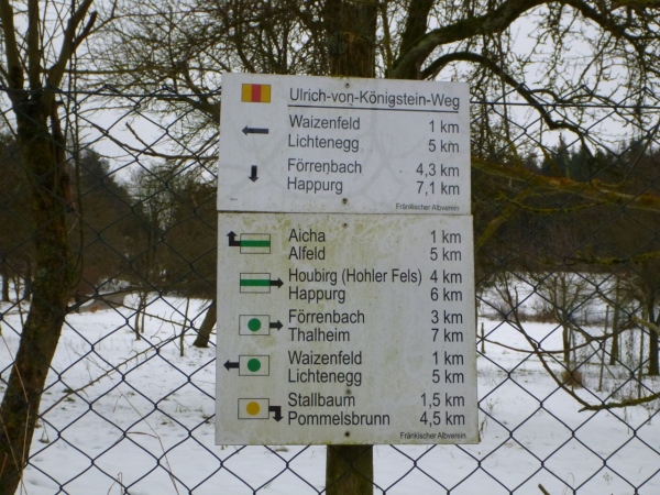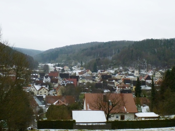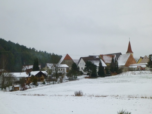 Nach gut 20 Minuten tangieren wir Hohenstadt, wo sich das Tal teilt. Die namensgebende Pegnitz schwenkt nach Norden und wir laufen in das Tal des Högenbachs, wo wir in der 5000 Einwohner zählenden Gemeinde Pommelsbrunn einen kurzen Blick auf die St. Laurentiuskirche (erstmals im Jahr 1403 urkundlich erwähnt) werfen. Der Ort wurde knapp 100 Jahre früher als Paumolsprunne in den Aufzeichnungen des Klosters Engelthal erwähnt. Der Name deutet auf einen Baumwald an einem Brunnen oder einer Quelle hin.