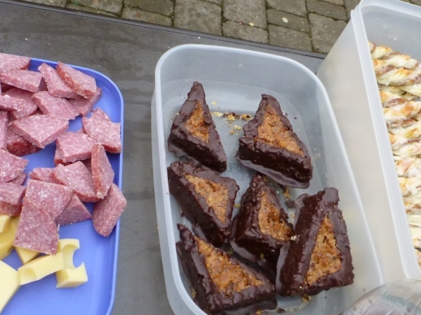An der Tankstelle klappt der Betrieb problemlos. Warmer Tee, Wasser, Kaffee, Cola, Suppenbrühe, Nussecken, Brezen, Mandelkuchen, Äpfel, Bananen, Nüsse, Schokolade stehen im Angebot. Wer da hungert, ist selber schuld. Nach fünf Minuten der erste Pfiff, das Signal, gleich laufen wir weiter. Knapp zehn Minuten nach dem zweiten Signal ist die Pause beendet und wir verlassen Mittelburg in Richtung Gunthersrieth.