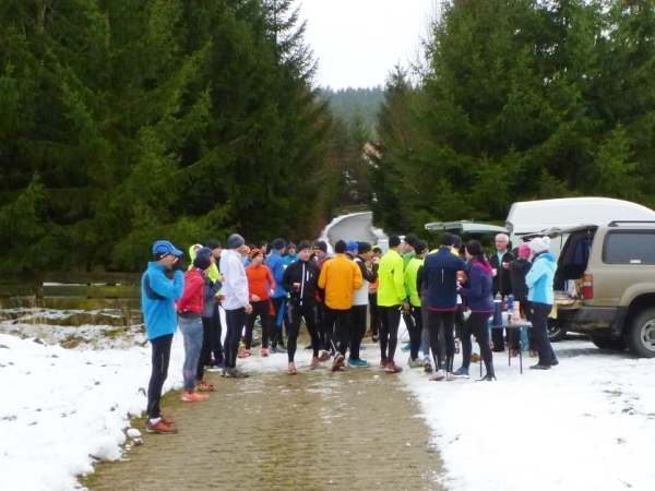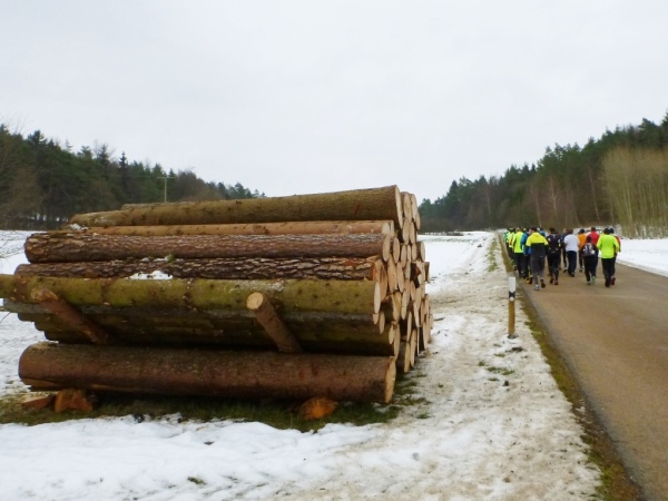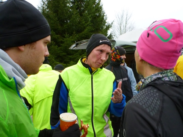 Wir werden hingewiesen, dass die ursprünglich geplante Strecke geändert werden muss. So werden einige Trailpassagen in den Wäldern aufgrund des Schnees auf befestigte Wege und kleinere Straßen verlegt. „Wir hätten ansonsten bei einer Verletzung eines Läufers immense Probleme“, so bei der Begrüßung durch einen Offiziellen, der selbst an der Spitze läuft und nicht überholt werden darf. Nach hinten werden zwei Radfahrer absichern.
