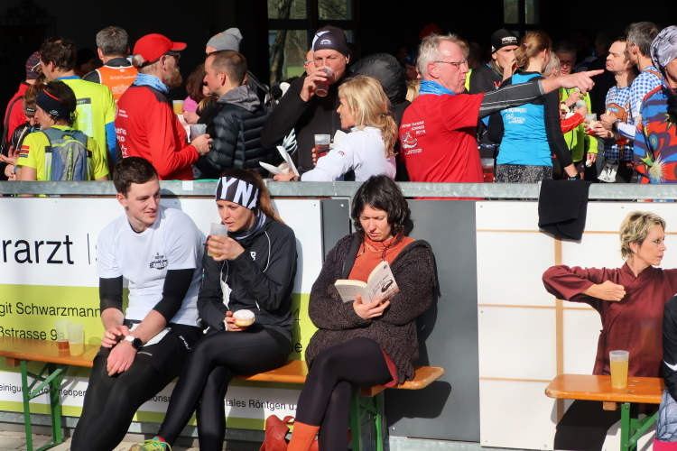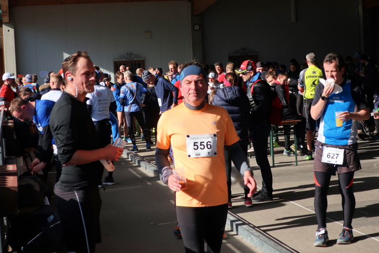 Wer sich für die gesamte Serie, wie das Gros der Teilnehmer, angemeldet hat, kann dank des Mottos "drei Läufe – eine Startnummer" gleich an die Startlinie gehen. Einzellaufstarter und Spontan-Nachmelder müssen erst die beeindruckend große offene Eisstockhalle im Sportpark besuchen, um ihre Startinsignie zu bekommen. Beachtlich ist der Andrang bei den Nachmeldern: Kein Wunder, lacht doch die Sonne bei kühlen Temperaturen vom Himmel und herrschen beste Laufbedingungen. Ansonsten hat man den Eindruck eines riesigen stimmungsvollen Läufer-Familientreffens.