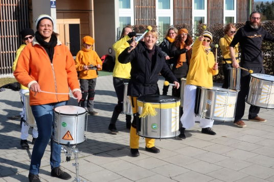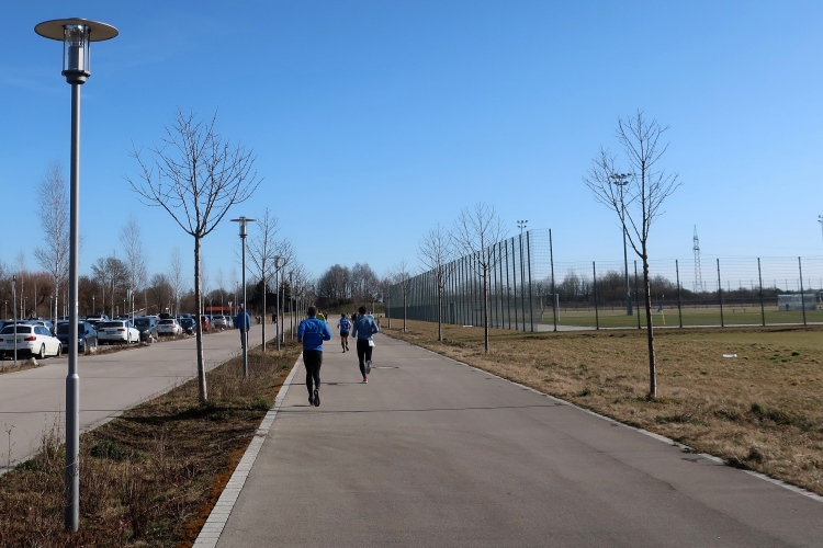 Abschied vom Fluss zu nehmen heißt es nach einem kurzen Anstieg hinter km 20, der uns vom Isarufer wieder auf hochwassersicheres Niveau bringt. Auf gleichem Weg, wie vom Start kommend, geht es über einen Asphaltweg und dann via Freisinger Straße dem Sportgelände des TSV Ismaning entgegen. Schon am Start hatten sie wild getrommelt – und auch jetzt noch sorgt eine Truppe ausdauernder Sambatrommler kurz vor dem Ziel für den letzten Schwung.