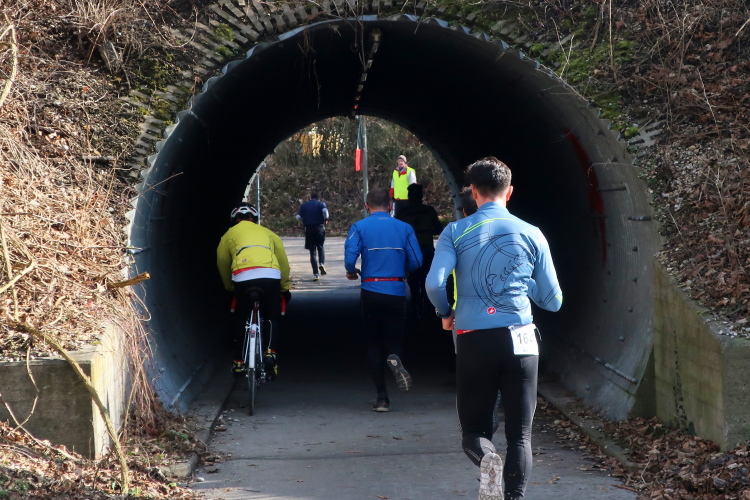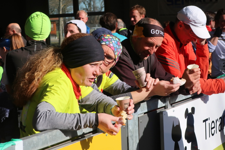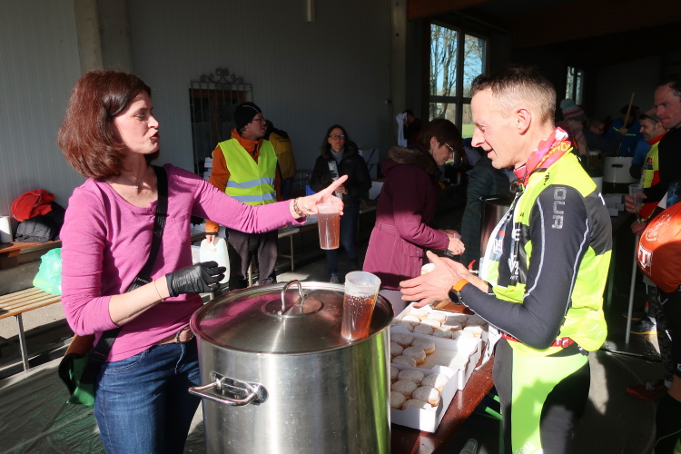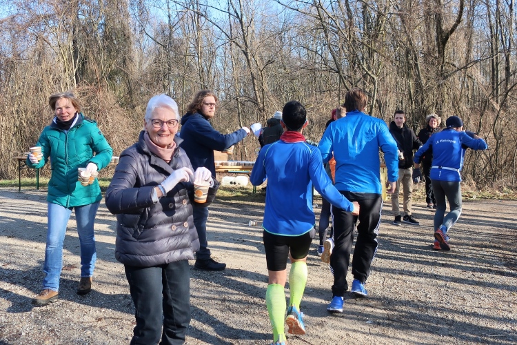 Eine willkommene Abwechslung ist der Verpflegungsposten nach 6,5 km. Freundliche Vereinsdamen halten uns schon die Getränkebecher entgegen. Lange hält sich zwar niemand auf, doch ein paar Schluck Wasser oder warmen Tee nehmen die meisten mit.