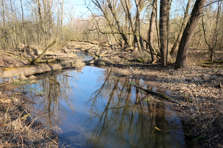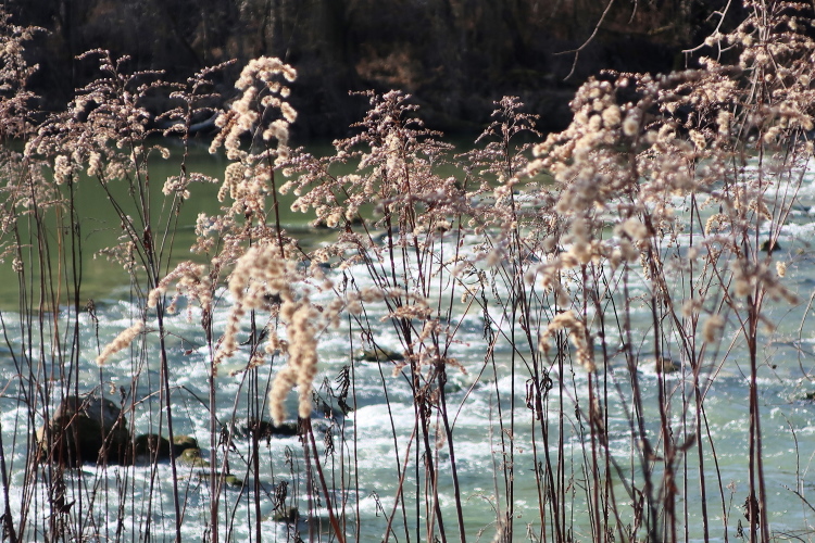 Geradezu meditativen Charakter hat, den Blick auf das meist in trägem Gleichlauf dahin strömende Wasser zu richten. Nur ab und an kommt an felsdurchsetzten „Stromschnellen“ ein wenig mehr Bewegung in die Szenerie. Allzu sehr innerlich abtauchen sollte man aber nicht, fordert der Kurs doch gewisse Aufmerksamkeit, will man nicht Balance und Reflexe in einer vereisten Pfütze oder bei einer sonstigen Bodenunebenheit austesten. Optisch besonders schön sind die im Sonnenlicht hellglänzenden Schilfgräser, deren trockenen Halme es wohl dem ausbleibenden Schnee zu verdanken haben, dass sie noch immer sanft im Wind wiegen.