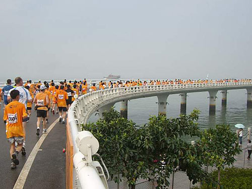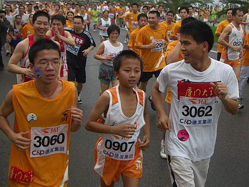 Wir durchlaufen das Starttor und nehmen Kurs auf Xiamen-City. Es geht vorbei an unzähligen Polizisten die als Streckenposten eingesetzt sind. Unmengen von Zuschauern beobachten den Start, klatschen und rufen begeistert den Läufern zu.