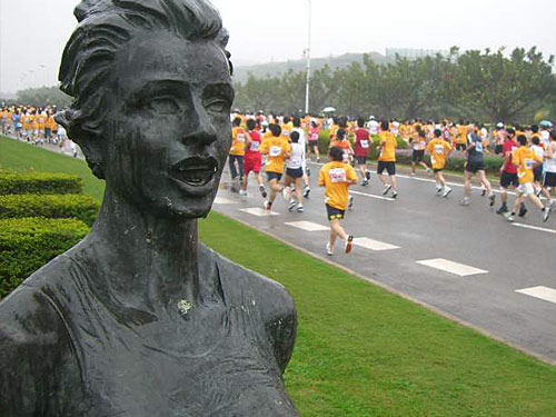 Etwa ab km 1 sind auf dem Grünstreifen zwischen den beiden Laufspuren lebensgroße Statuen von Marathonläufern angeordnet. 99 Stück sind es, Sport und Marathon wird in China GROSS geschrieben.