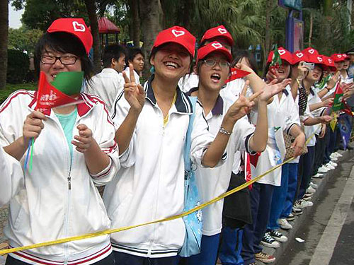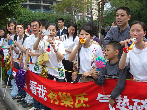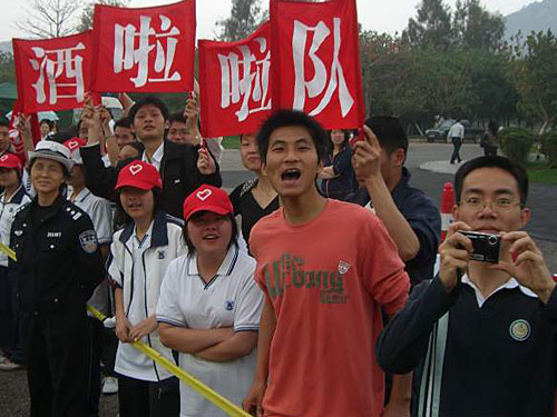 Es geht weiter, die Zuschauermassen nehmen kein Ende. Begeisterung ohne Ende. Ich habe den Eindruck, daß alle Chinesen von Ihrem Arbeitgeber freigestellt wurden, um Stimmung an der Laufstrecke zu machen. Vor einem Krankenhaus stehen etwa 50 Krankenschwestern und rufen mir begeistert zu.