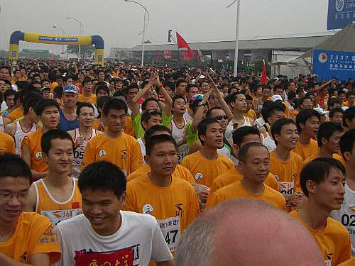 24.500 Teilnehmer (ca. 5000 Marathonläufer) des Xiamen Marathon warten im Startbereich auf den Startschuss um 8:00 Uhr. Dazwischen eine Hand voll Europäer. Hier sind wir die Exoten. Die Chinesen um mich herum sind von mir begeistert und fragen nach meiner Herkunft. Germany, viele wissen nicht, wo das ist, andere sind begeistert und schwärmen davon, schon einmal in Germany gewesen zu sein.