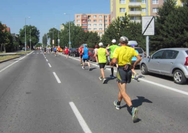 Gleich am Anfang bemerke ich, dass die Strecke schon auf dem ersten Kilometer auf einer Nebenfahrbahn verläuft, 2013 sind wir rasch auf die Hviezdoslavova, eine Durchzugsstraße mit ansonsten viel Verkehr, abgebogen. Beim Start ist jedoch der Kurs für den Verkehr komplett gesperrt, sodass auf den ersten gut 3 km bis zu einem Übergang über die Bahngleise, wo der Kurs nach Süden abbiegt, keine Autos die Läufer von vorne oder hinten beeinträchtigen.