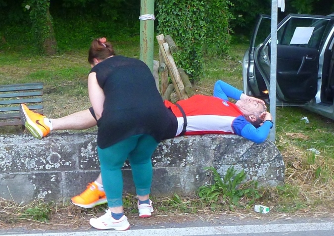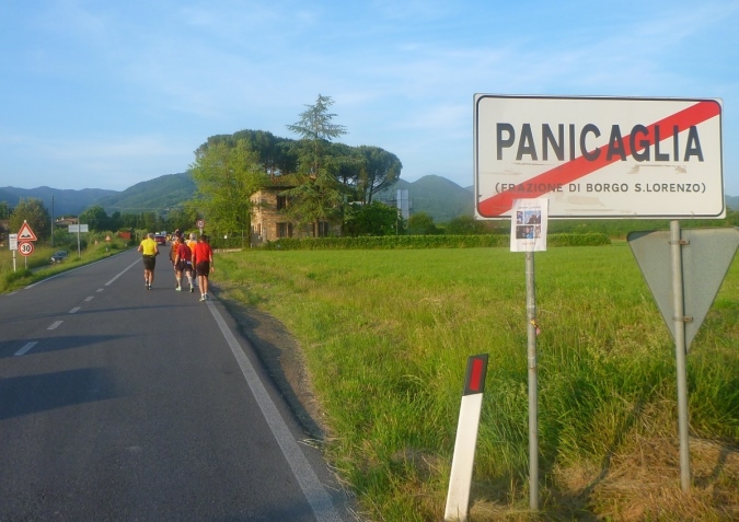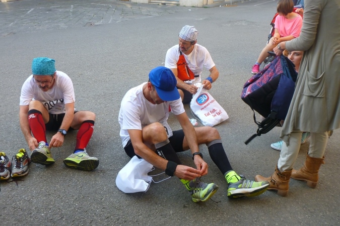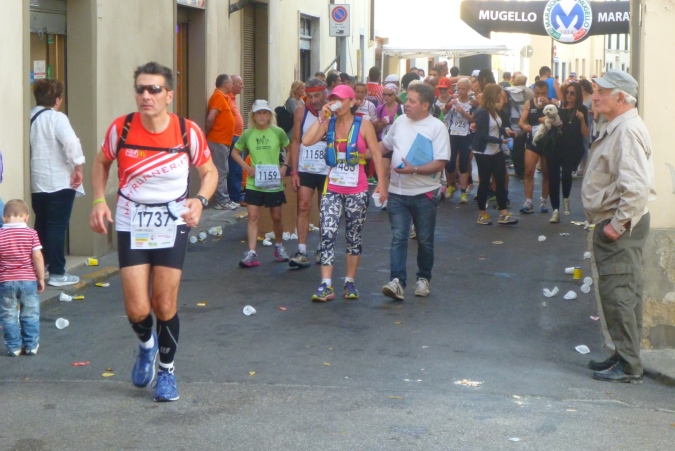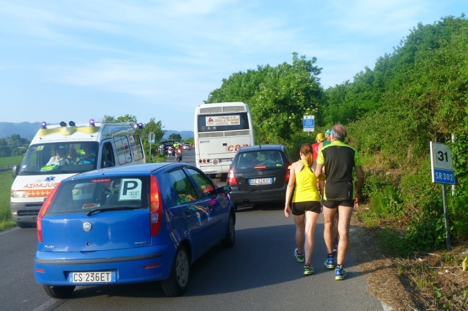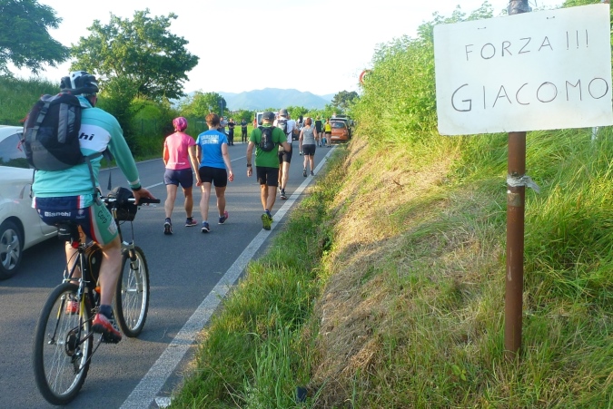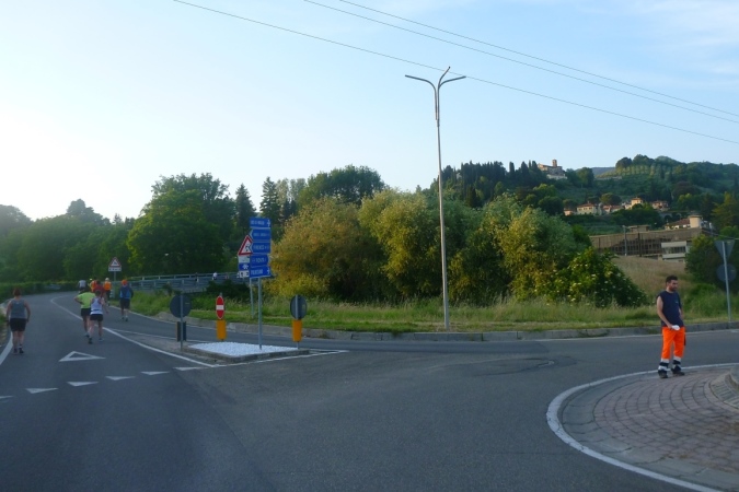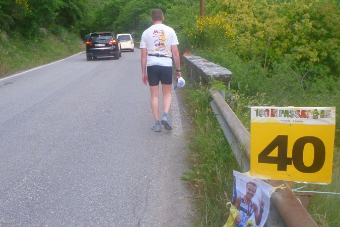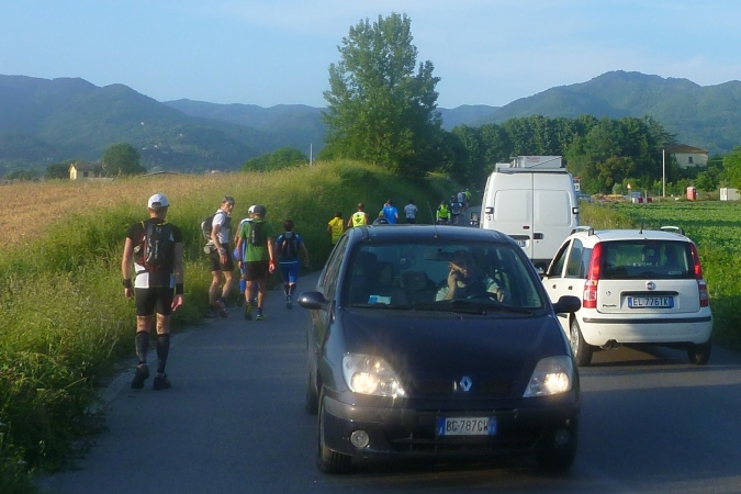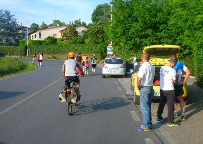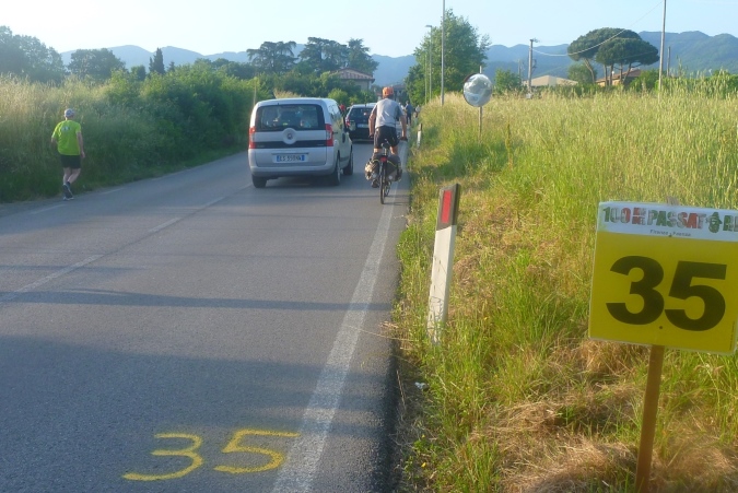 Dazu kommen viele Begleiter von Läufern oder Läufergruppen, die mit Autos, ja sogar großen Wohnmobilen, unterwegs sind. Ich sehe im Verlaufe des Passatore immer wieder die gleichen Autos/Wohnmobile am Straßenrand stehen oder an uns vorbeifahren. Noch nie habe ich so viele Läufer sich bei einem Lauf unterwegs umziehen oder die Schuhe wechseln gesehen, wie hier.