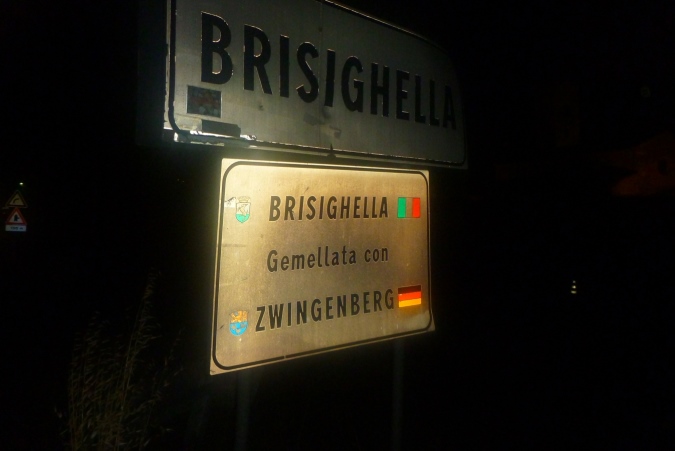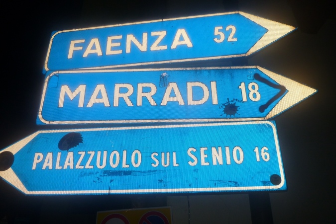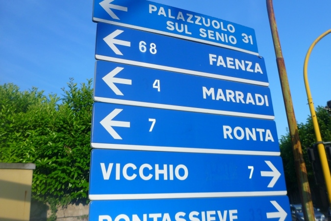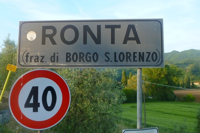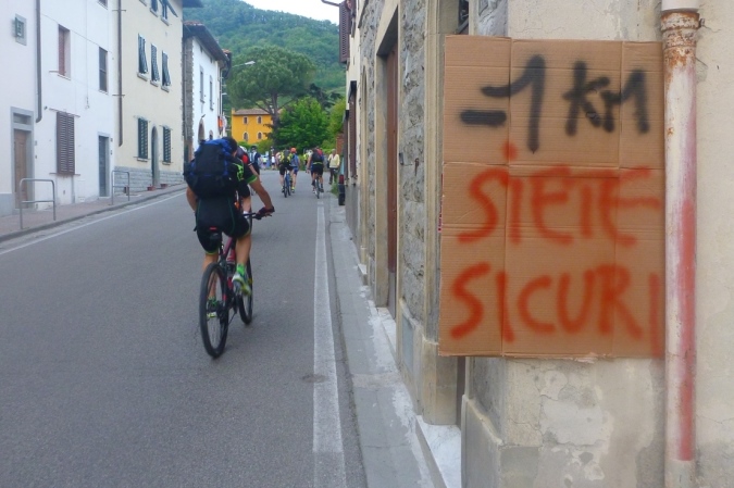 Das Durchlaufen des Ortes hat was und ist eine schöne Abwechslung nach den vielen Landschaftskilometern. Am Ortsende steht ein Hinweisschild: Nur noch 68 Km bis nach Faenza. Ich denke positiv. Fast ein Drittel ist schon geschafft.