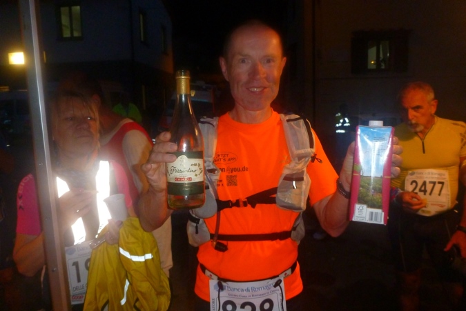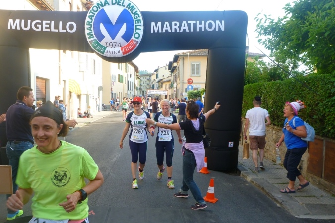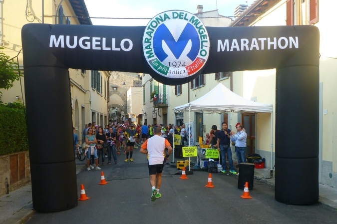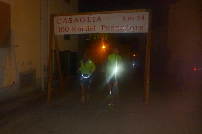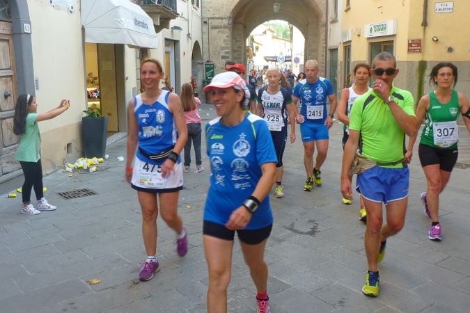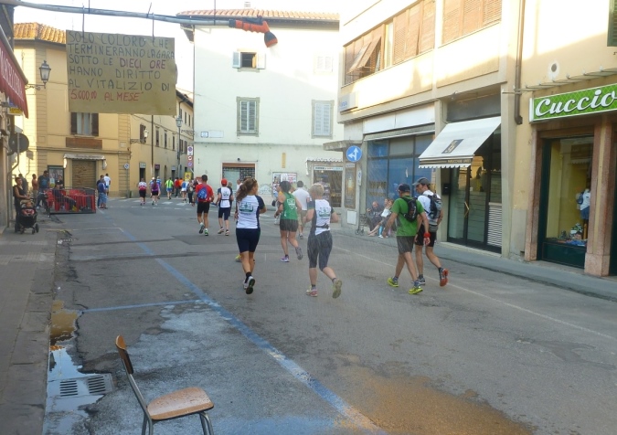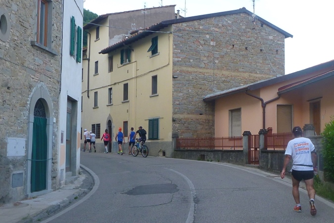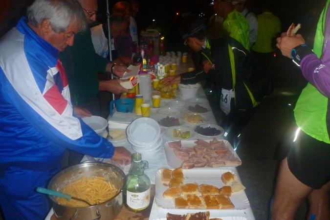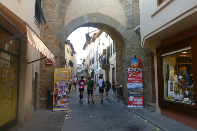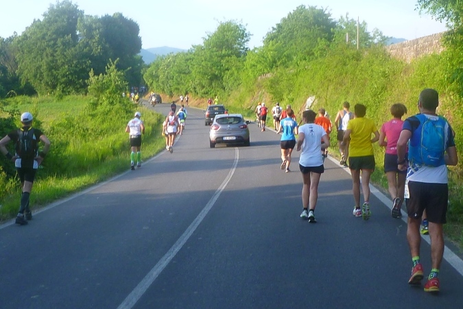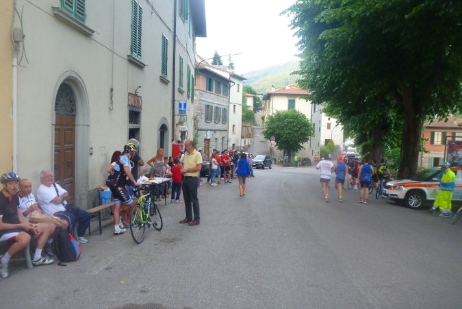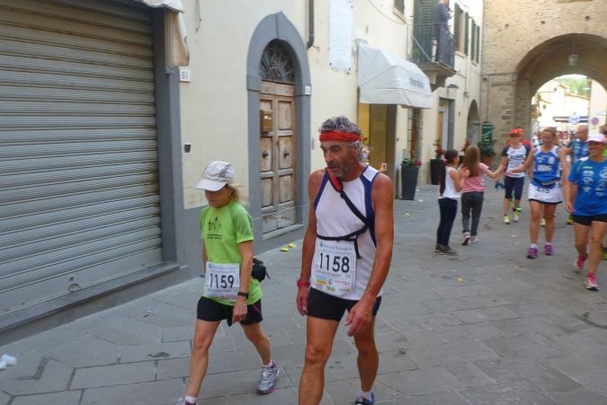 Jetzt kommt der zweite, längere Aufstieg. Und der hat es in sich. Es geht hinauf auf 913 m. Dort oben ist bei Km 48 fast die Hälfte geschafft. Aber da müssen wir erst einmal hinauf. Das geht leichter, wenn man nette Gesprächspartner hat. So etwa Antonio aus Florenz. Auch er ist Wiederholungstäter beim Passatore. Er empfiehlt mir den Florenz Marathon Ende November. „Den musst Du laufen“. Das sagt auch Maria aus Brescia über den Marathon in ihrer Heimatstadt.