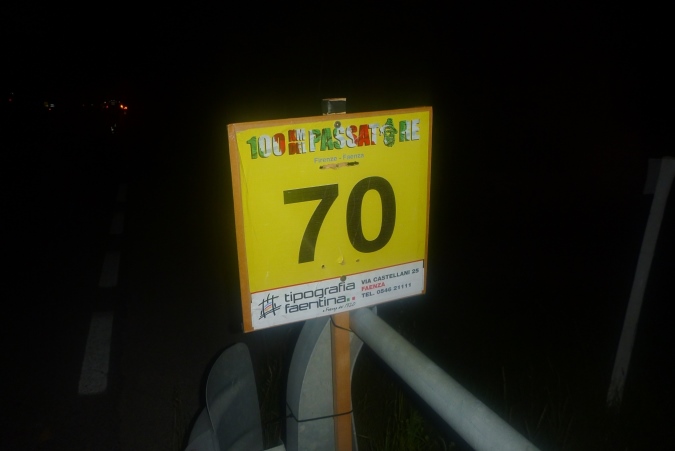 Nach Km 95 ist zur Motivation jeder Km einzeln beschildert. Somit sind es insgesamt 24 gelbe Km-Schilder auf der gesamten Strecke. Ich fühle mich beflügelt. Bald habe ich es geschafft. Wir laufen in Faenza ein. Die Rotanda 100 Km del Passatore nimmt uns auf und bringt uns zum Km-Schild 98.