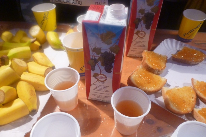 Oben angekommen ist eine weitere Zeitmessmatte zu überlaufen und ein Ristoro bietet Stärkung. Klar, hier stehen Läufer und laben sich. Und schon gibt es auf der Passstraße Stau. Ein dicker Bus kommt nicht an den Läufern vorbei. Wild hupend will der Fahrer sein Durchkommen erzwingen. Prima, wegen des Staus kann man bergab eine Weile ohne Verkehr von hinten laufen.