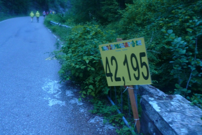 Ein Schild zeigt an, dass wir bereits die Marathondistanz gelaufen sind. Weiter geht es nach oben. Die Passhöhe kommt näher. Es ist zwar weiter ein Kampf, aber er fällt nunmehr leichter. Ich fühle mich, nachdem die Hitze endlich vorüber ist, richtig erleichtert.