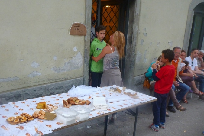 Bei Vetta le Croci (Km 16,5) ist fürs erste Schluss mit aufwärts. Es geht von 518 m hinunter bis nach Borgo San Lorenzo (195 m, Km 31,5). Unterwegs fällt mir Nicola auf. Er hat seine Haarpracht mittels Perücke seiner Begleiterin angepasst.