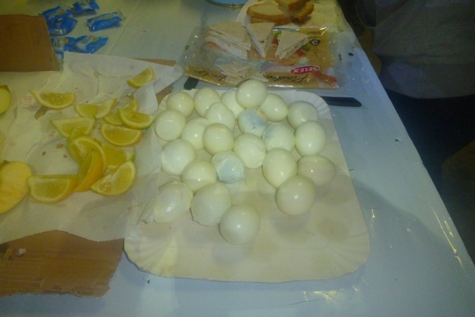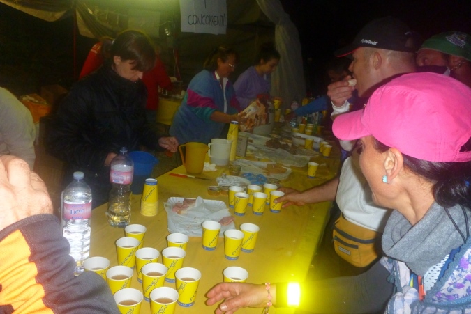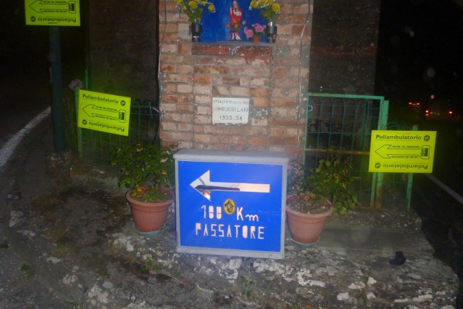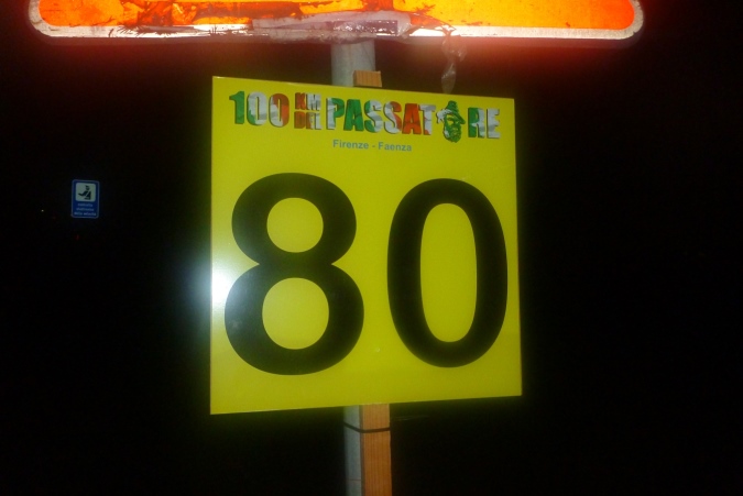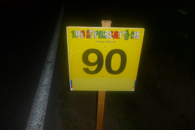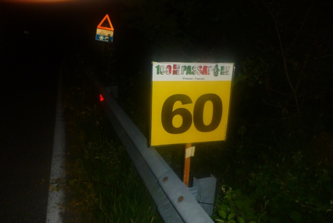 Bei Km 60 beschließe ich, einen Moment zu rasten. Bis dahin greife ich nur kurz bei den Ristoros zu und mache ein Foto der gelben Km-Schilder. Den angebotenen leckeren Chianti lasse an den Ristoros übrigens unbeachtet. Dafür nehme ich gerne Cola und Schnittchen mit Mortadella. Auch Eier werden angeboten. Und, und, und. Lecker …