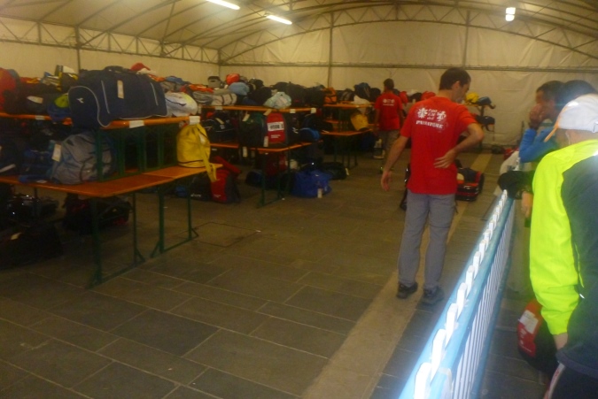 Jetzt heißt es Medaille in Empfang nehmen und den Leihchip gegen drei Flaschen Wein tauschen. Das nenne ich doch mal ein wahres Finishergeschenk. Kleider abholen und Shuttlebus zu den Duschen stehen als nächstes an. Ich will mich nicht lange im Ziel aufhalten. Mir wird kalt. Schön, dass es bei den Duschen im Gymnasium weitere Getränke und Verpflegung gibt. So eine Dusche nach einem Hunderter mit dem Geschmack eines Mortadella-Schnittchens im Mund hat was.
