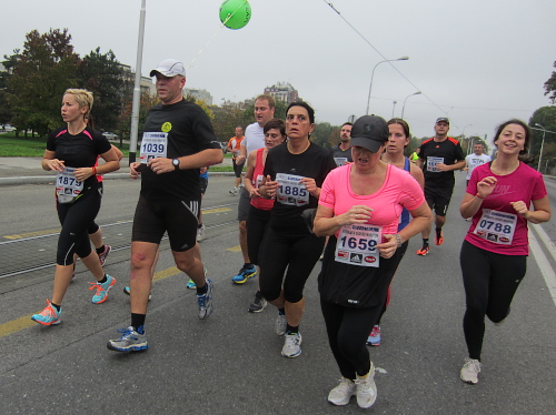 Ich halte Ausschau nach dem deutschen Pärchen – sie sind ca. 400 m vor mir, also haben sie sich nicht so beeilt. Doch nun werden sie schneller, der Vorsprung wird größer. Bei Kilometer 23 sind sie plötzlich verschwunden. Ich wundere mich. Dann kommt erneut die Labestation. Jetzt tauchen die beiden 100 MC-Läufer wieder auf. Ich warte auf sie. Er stellt sich als Mario Sagasser aus Hamburg vor, die Begleiterin ist seine Gattin Doris. Seit Freitag sind sie schon in Zagreb, vor 2 Wochen sind sie den Berlin-Marathon gelaufen. Mario und Doris sind Marathontouristen wie ich. Er ist Angehöriger des Vorstands im deutschen 100 Marathon Club. Er macht mich auf ein von der Event-Agentur Eichels veranstaltetes internationales Treffen von Mitgliedern europa- und weltweiter 100 Marathon Clubs im Rahmen des Hannover-Marathons im April 2014 aufmerksam. Ein entsprechendes Verständigungsmail habe ich inzwischen von der Agentur erhalten und an alle Mitglieder in unserem Club verschickt.
