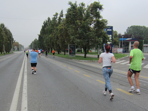 Die 5 km-Läufer starteten knapp nach uns. Nach eineinhalb Kilometer brausen schon die ersten von hinten heran, jetzt vor Kilometer 3 auf der linken Seite schon wieder auf uns zu. Ich bleibe kurz stehen, um zu fotografieren. Die 2:15er-Halbmarathon-Pacemaker-Gruppe rückt näher. Darunter ist eine attraktive Läuferin Mitte Vierzig, die mir wegen ihres lautem Atems auffällt. Sie trägt die Startnummer 1885 und scheint das Tempo nicht mithalten zu können. Wir sind knapp vor der 5 km-Tafel, der Kurs führt auf langgezogenen Geraden mit kaum merklichen, aber vorhandenen Steigungen immer stadtauswärts. Zu sehen gibt es nichts außer der Straßenbahn, die links und rechts am äußeren Fahrbahnrand der Laufstrecke auf dem Schienenstrang in relativ dichten Intervallen verkehrt. Für Autos ist der insgesamt viermal zu laufende Marathonkurs gesperrt.