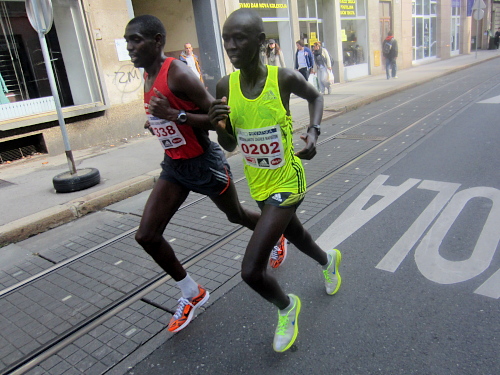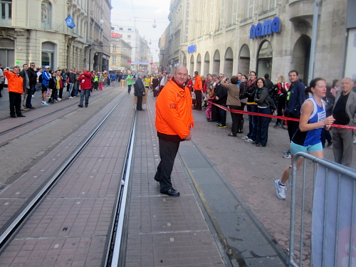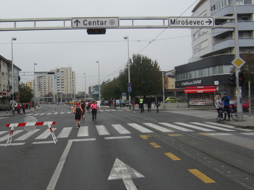 Es geht nun bei der Martićeva-Straße wieder kurz in östliche Richtung, dann im rechten Winkel die Jurišićeva leicht aufwärts zum Jelačić-Platz. Hier verlaufen doppelte Gleise der Straßenbahntrasse, einige Passagen sind mit Pflastersteinen ausgelegt, die im Vergleich zu Bratislava, Florenz oder Rom nicht einmal erwähnenswert sind. Und hier stehen auch die einzigen, wenigen Zuschauer, die mir bisher aufgefallen sind. Doch niemand applaudiert – bei einem Marathon, der nur 5 Stunden offen ist und sich alles auf die Spitze des Feldes konzentriert, auch nicht verwunderlich.
