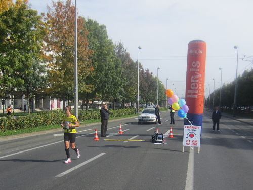 Bei Kilometer 19 erblicke ich fast schon auf dem Weg in die zweite Runde das deutsche Pärchen vom 100 Marathonclub. Der blonde Mann Mitte 40 zückt wie ich seine Kamera, wir fotografieren uns gegenseitig. Ich nehme mir vor, die beiden einzuholen, sie sind weniger als einen Kilometer vor mir. Bei der einzigen Labestelle nach inzwischen 7 Km bleibe ich stehen und mische einen Becher Wasser mit Iso. Nach der Wende sehe ich die letzte Halbmarathonläuferin, begleitet von zwei Polizisten auf schweren Maschinen. Ich kenne das Gefühl, Letzter zu sein inzwischen schon zur Genüge.
