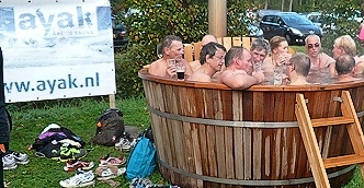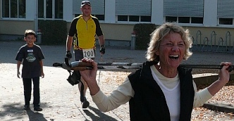 Die Teilnehmer der kroatischen Busreise empfangen einen der Ihren im Ziel mit einer Sektdusche und machen noch mal richtig Stimmung. Großes Hallo und Finisherfoto