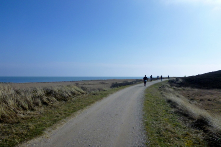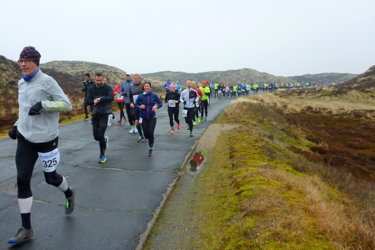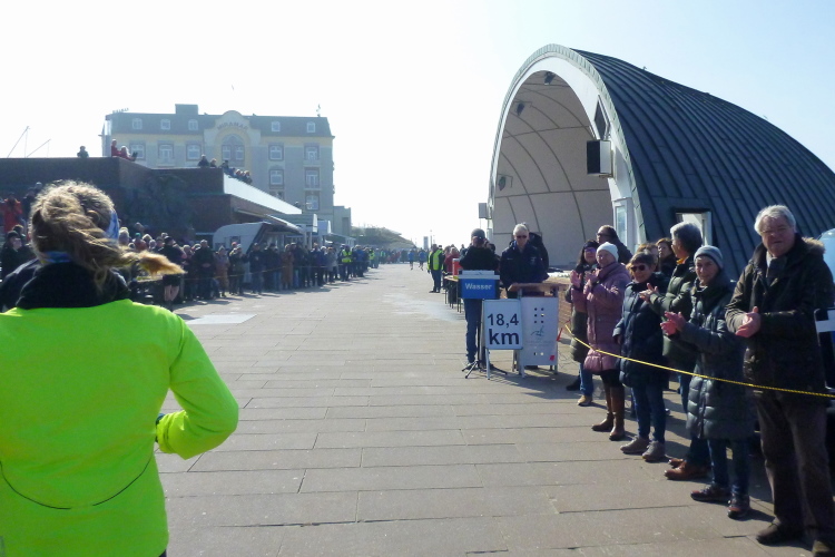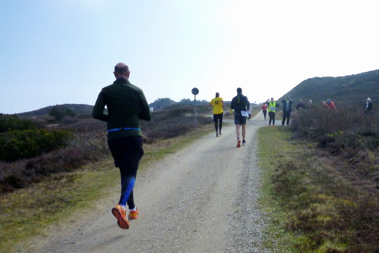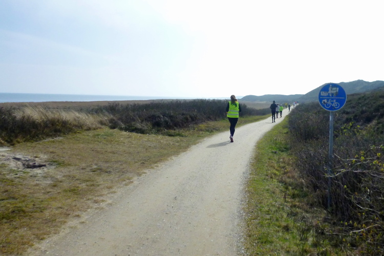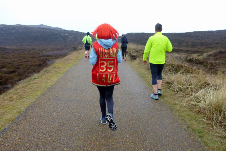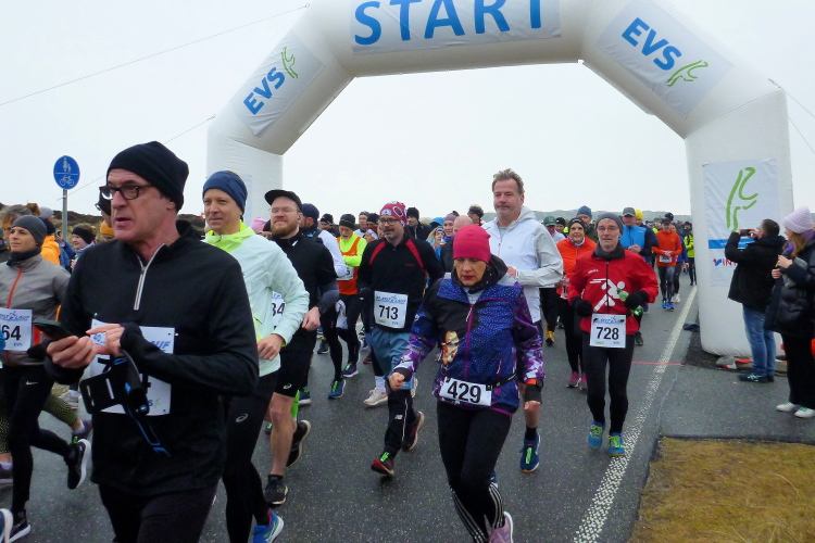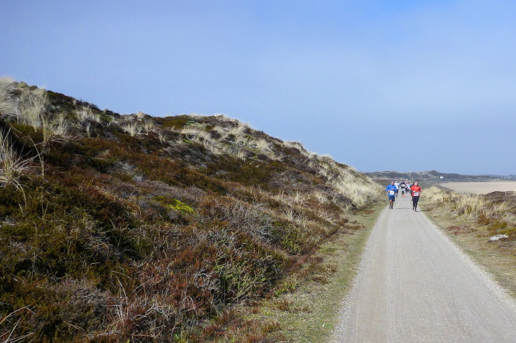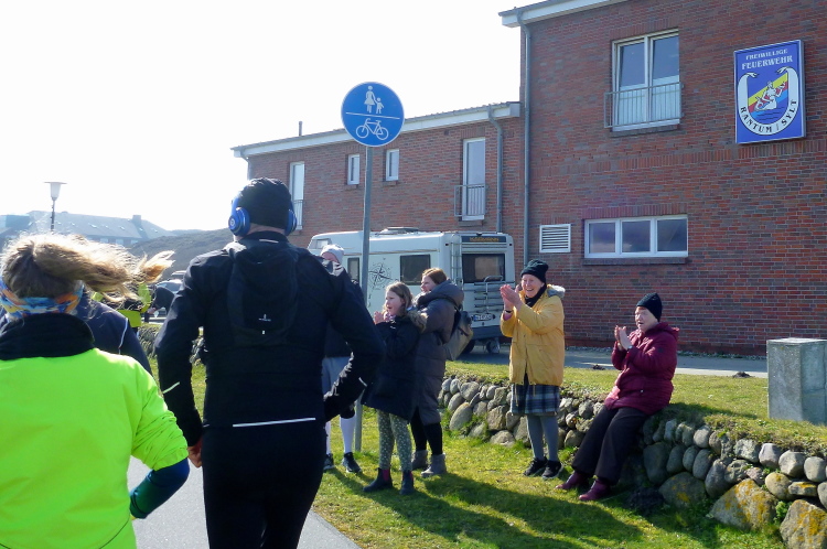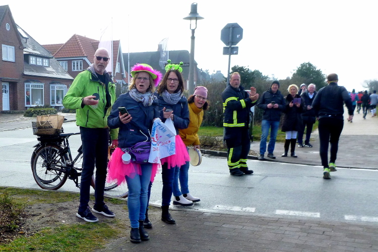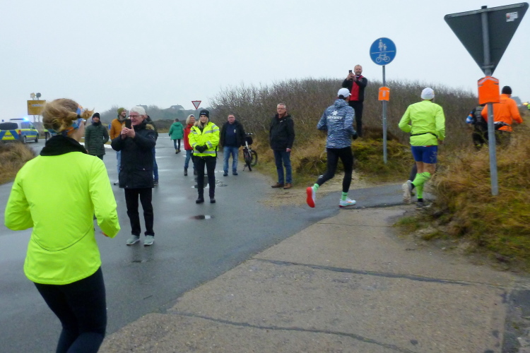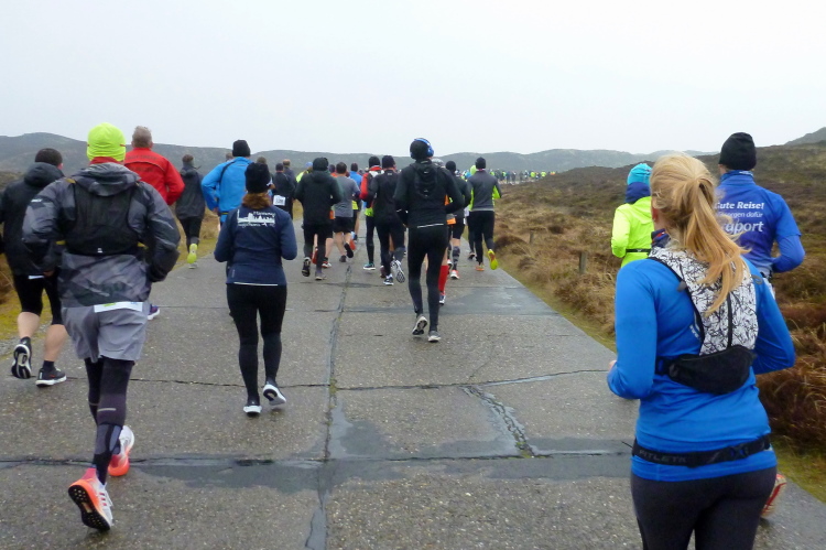 Was hat es hier nicht schon alles an Wetter gegeben! Selten mild, häufig stürmisch und nass bis hin zu richtigem Schietwetter. Eine Inselbesichtigung der ganz besonderen Art ist dies also in aller Regel, nur etwas für Hartgesottene, nicht für Weicheier. Heute ist uns Trockenheit bei etwa acht Grad versprochen, weshalb ich mich als alter Hase mit je einem Langarmshirt und Windbreaker begnüge. Unter den Startern sind auch Iris und Jürgen aus meinem Laufumfeld, die mit einer Gruppe angereist sind, und über deren Anwesenheit ich mich sehr freue. Um zehn Uhr hat es sich dann ausgefreut, denn et jäht loss, die Schnellsten im Achselshirt, uaaaah...