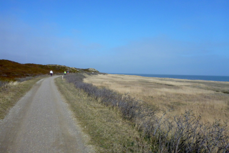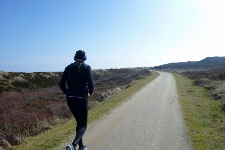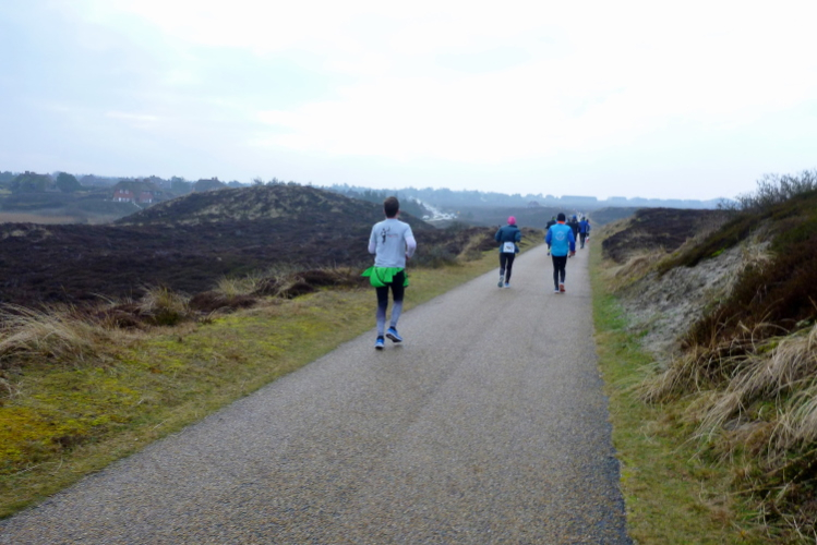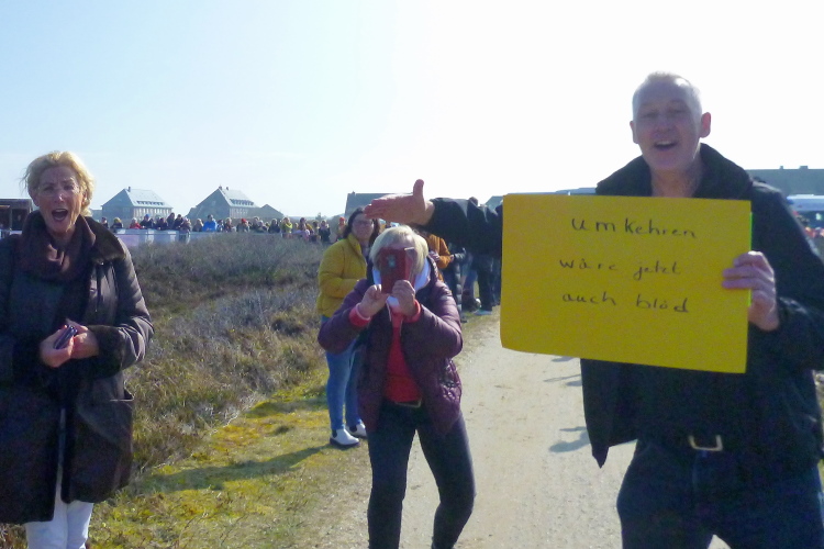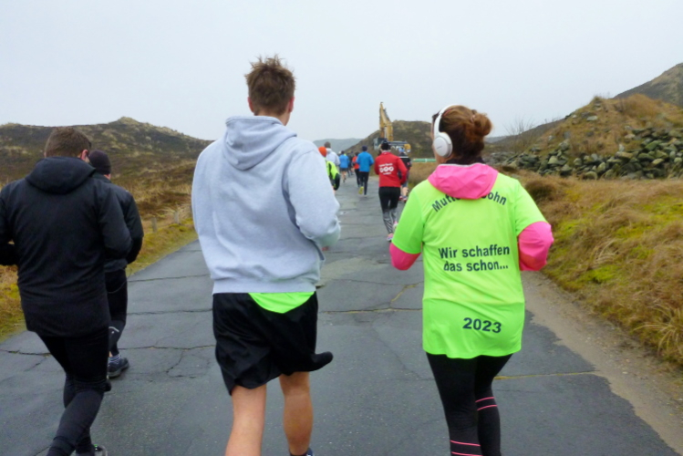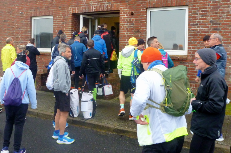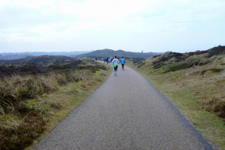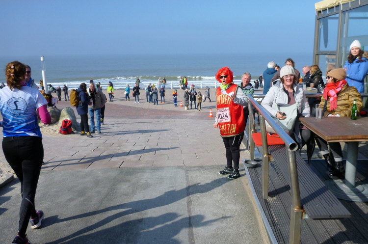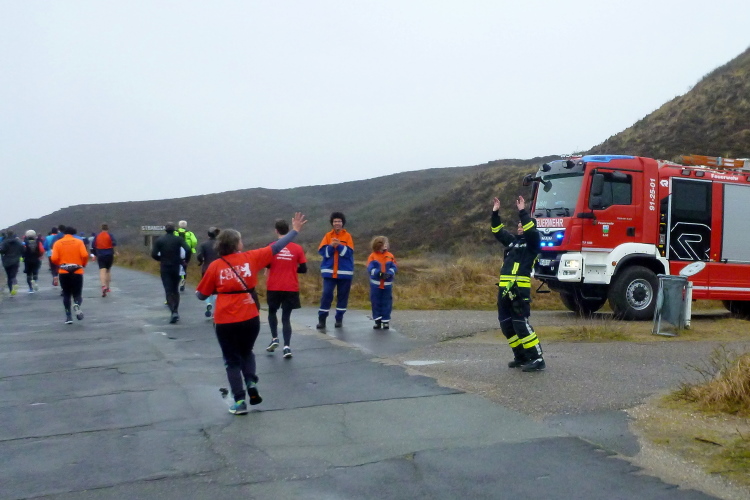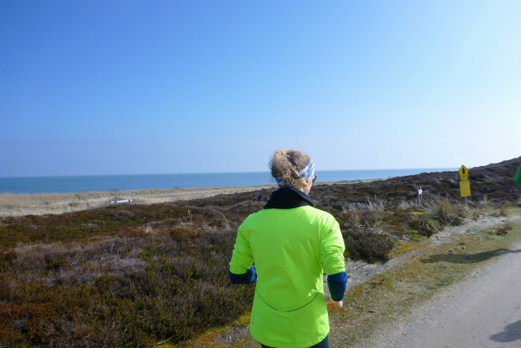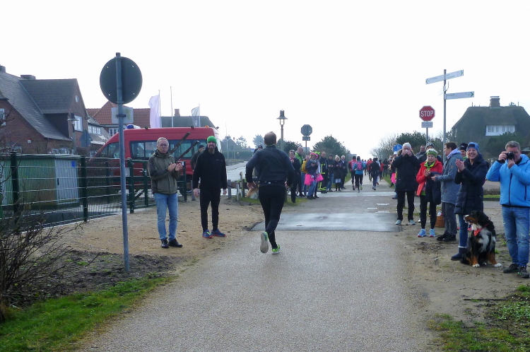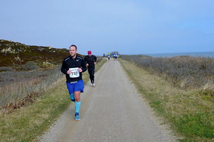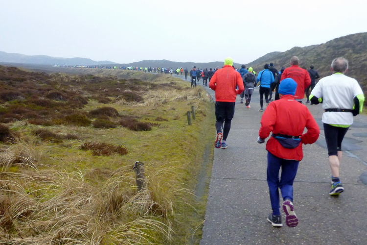 Was hat es hier nicht schon alles an Wetter gegeben! Selten mild, häufig stürmisch und nass bis hin zu richtigem Schietwetter. Eine Inselbesichtigung der ganz besonderen Art ist dies also in aller Regel, nur etwas für Hartgesottene, nicht für Weicheier. Heute ist uns Trockenheit bei etwa acht Grad versprochen, weshalb ich mich als alter Hase mit je einem Langarmshirt und Windbreaker begnüge. Unter den Startern sind auch Iris und Jürgen aus meinem Laufumfeld, die mit einer Gruppe angereist sind, und über deren Anwesenheit ich mich sehr freue. Um zehn Uhr hat es sich dann ausgefreut, denn et jäht loss, die Schnellsten im Achselshirt, uaaaah...