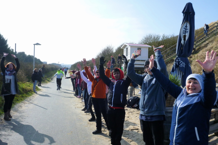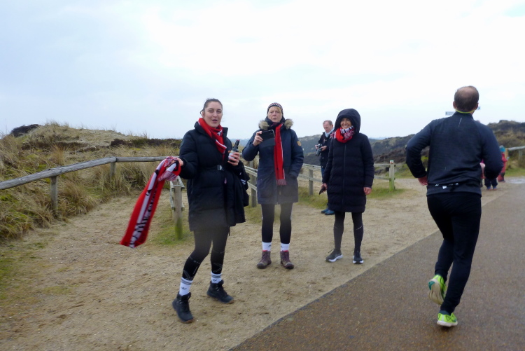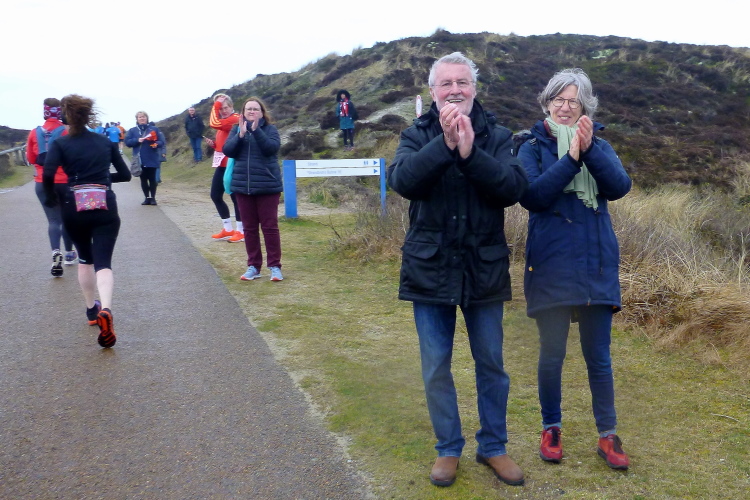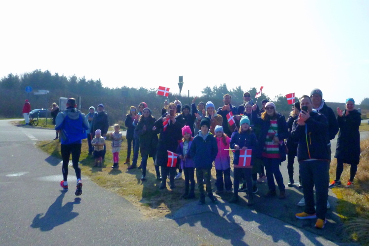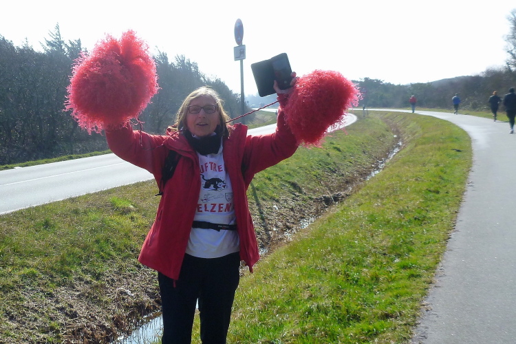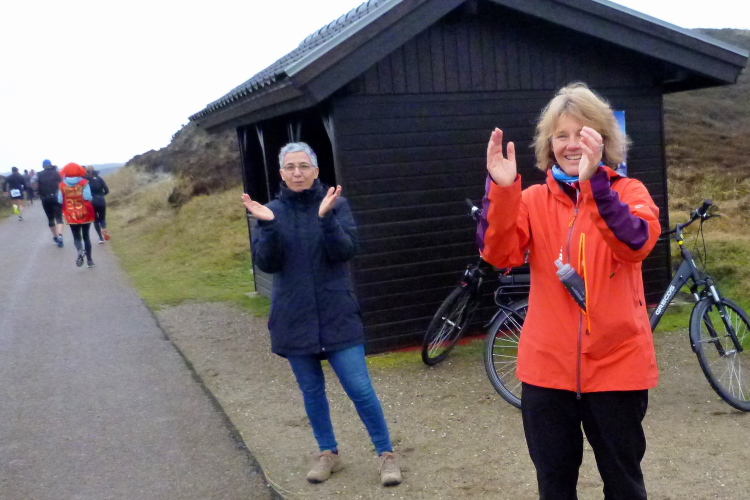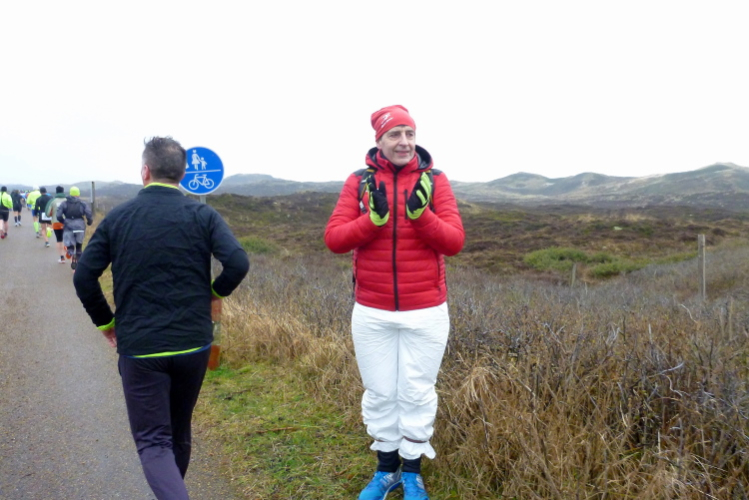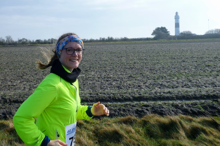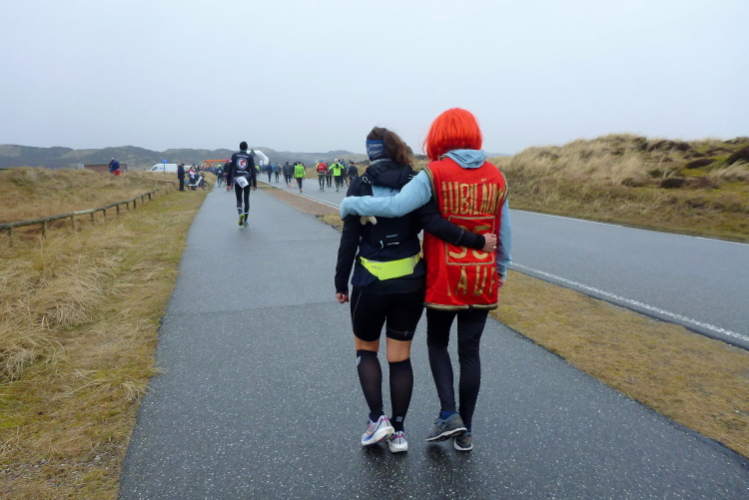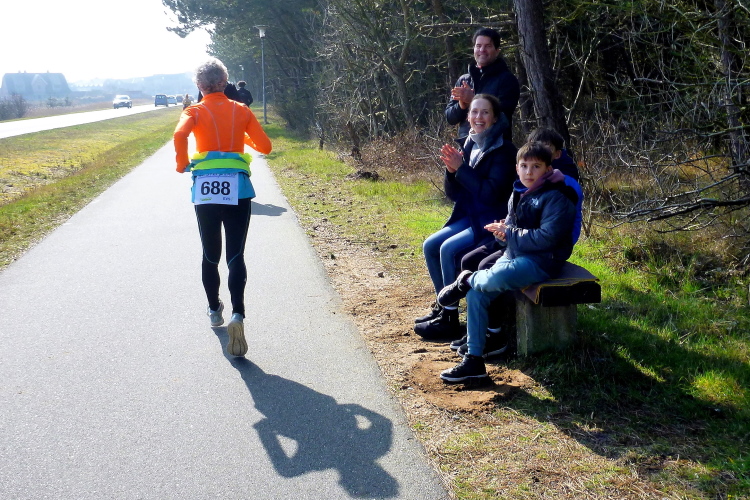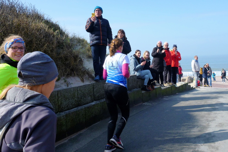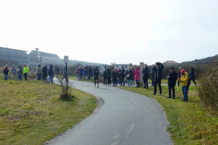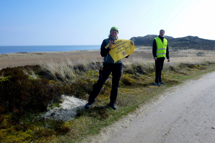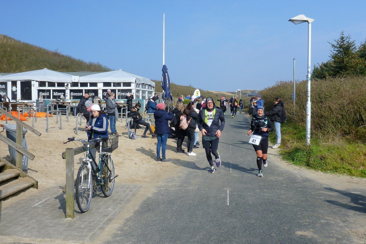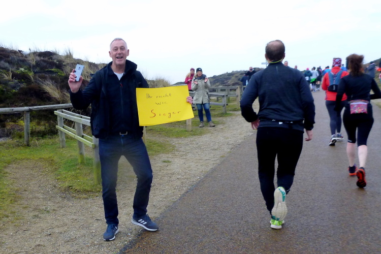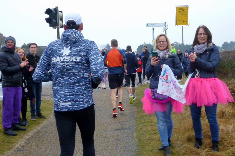 Die ersten Fans tauchen auf, mit dem Rad ist man hier ja besonders mobil und benötigt keinen Parkplatz. Ein Edelfan wird immer wieder auftauchen und uns mit flotten Sprüchen auf selbstgemachten Schildern erfreuen. Wir passieren das berühmte Strandbistro Buhne 16, allerdings ohne es sehen zu können. Aus der Entfernung grüßt bereits der Kampener Leuchtturm. Auf leicht kurvigem Kurs kommen wir kurzweilig voran, die km fliegen nur so vorbei. Das ist zu nicht geringem Teil Marike geschuldet, die sich als äußerst nette Begleiterin entpuppt und viel zu erzählen hat. Beide Elternteile sind ehemalige Marathonläufer, mit dem Zwillingsbruder möchte sie in absehbarer Zeit ihr Debut auf der Königsstrecke geben. Welch ein Unglück für sie, mit jemandem zusammenzulaufen, der zu diesem Thema nichts beizutragen hat. Ich hoffe, der Gymnasiallehrerin kein Ohr abgekaut zu haben.