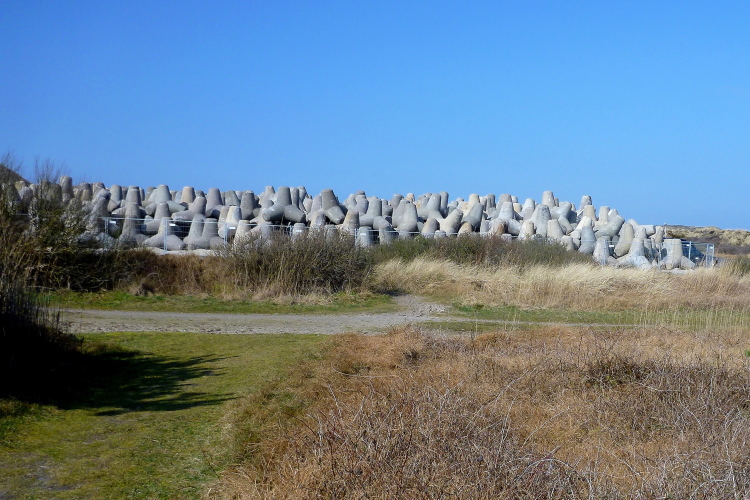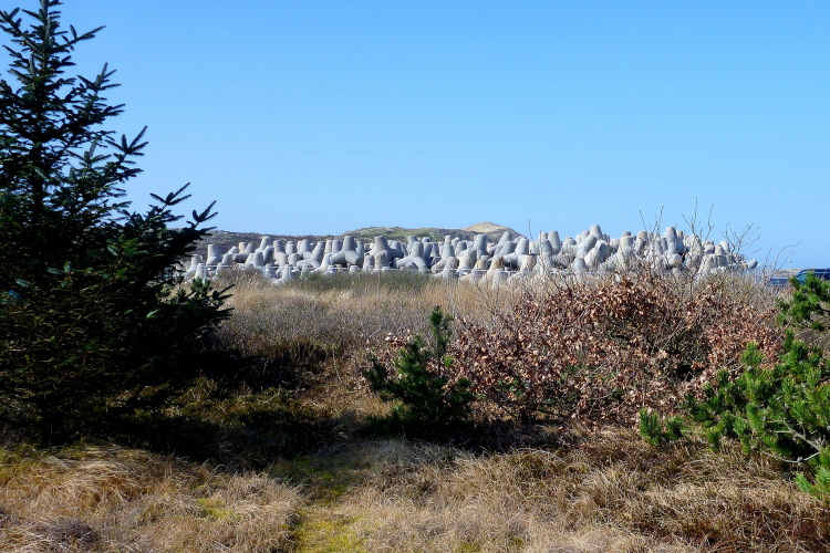 Eine dänische Kolonie macht einen Riesenradau, direkt dahinter entdecke ich eine Ansammlung geparkter Tetrapoden. Mit denen hofft(e) man, der alljährlichen Erosion durch Winterstürme Einhalt zu gebieten und den gigantischen Sandverlust zu reduzieren. Zumindest an einer Stelle war das wohl ein Griff ins Klo gewesen, die jeweils sechs Tonnen schweren Ungetüme versanken mir nichts dir nichts im Meer. Zweieinhalbtausend von denen hat man mit Mühe später wieder an Land geholt.