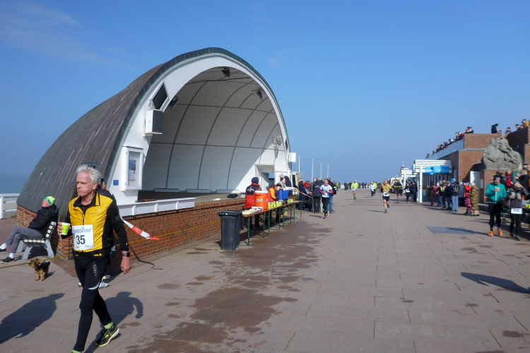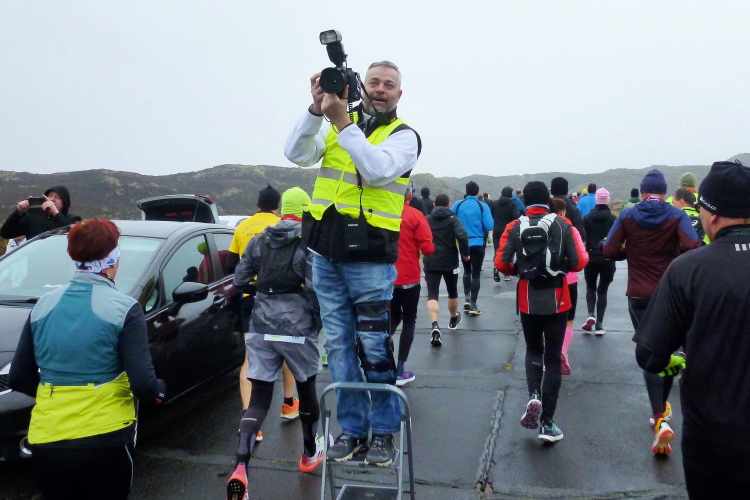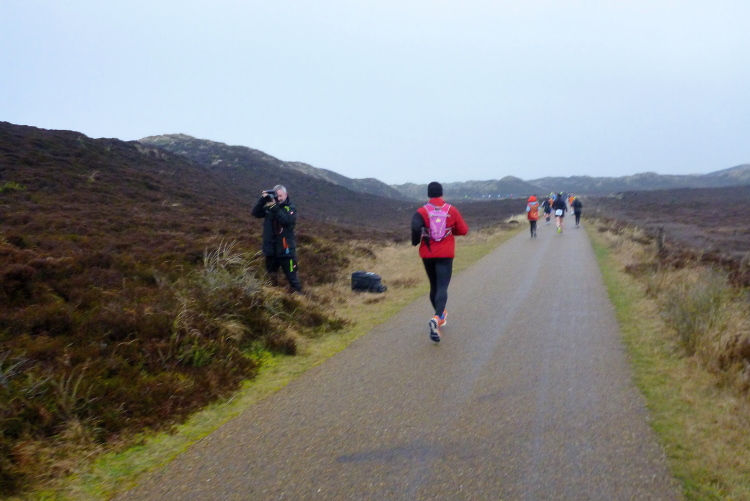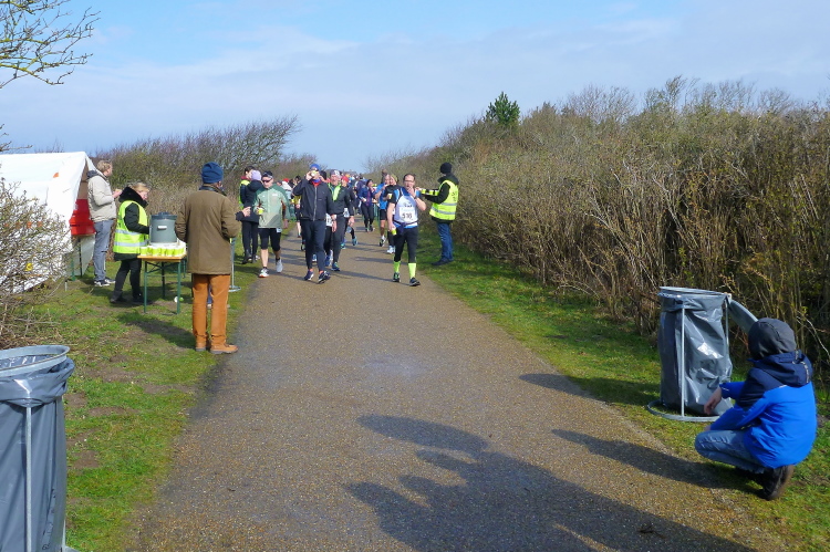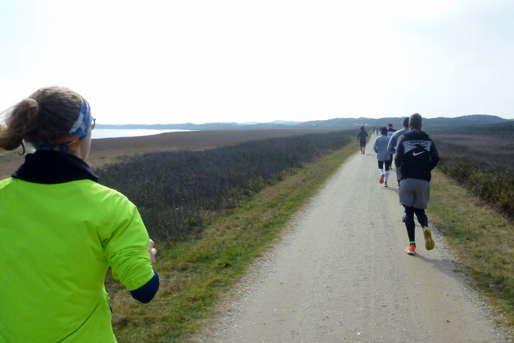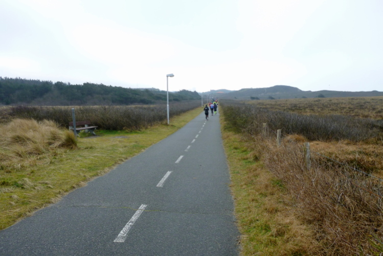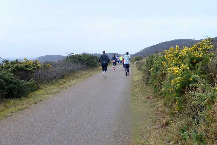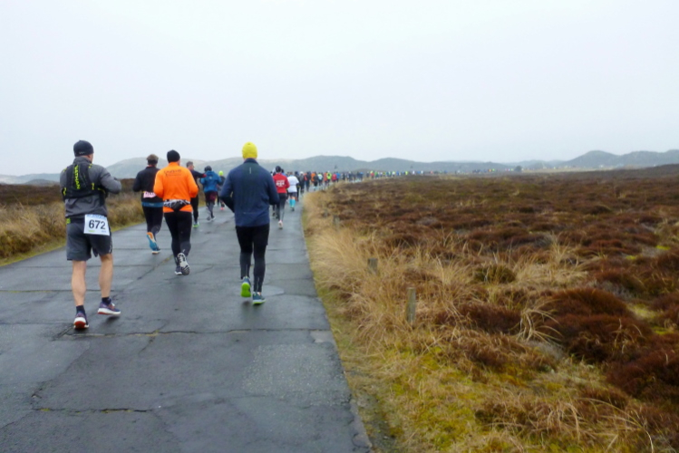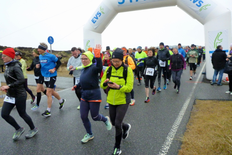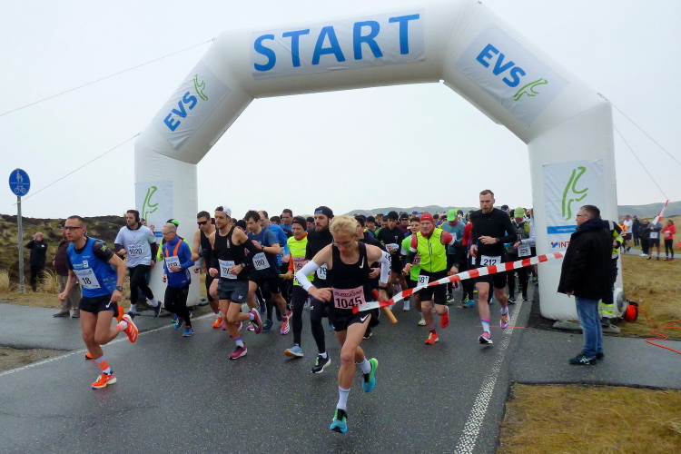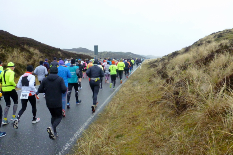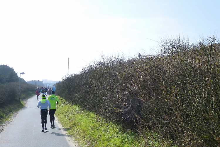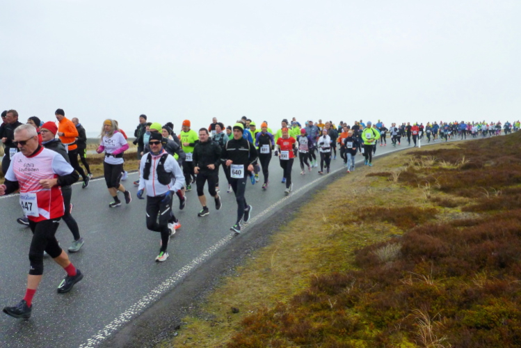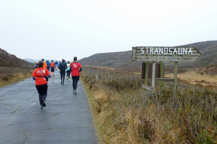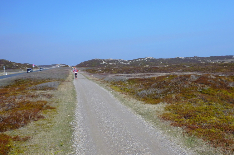 Auf der breiten, asphaltierten Straße können die Läufer aus allen Ecken der Republik schon bald im individuell gewünschten Tempo ausschreiten, die Laune ist allseits prächtig. Von den Feuerwehrkameraden angefeuert, wechseln wir auf den parallel zur zwischen Nord und Süd verlaufenden Insel-Hauptstraße gelegenen Radweg. Da sich das Feld bereits ordentlich verteilt hat, gibt es, zumindest um mich herum, kein Platzproblem. Leider ist die Optik etwas traurig, da das Frühjahr noch auf sich warten lässt und sich daher alles im braun-grauen Einheitslook präsentiert.