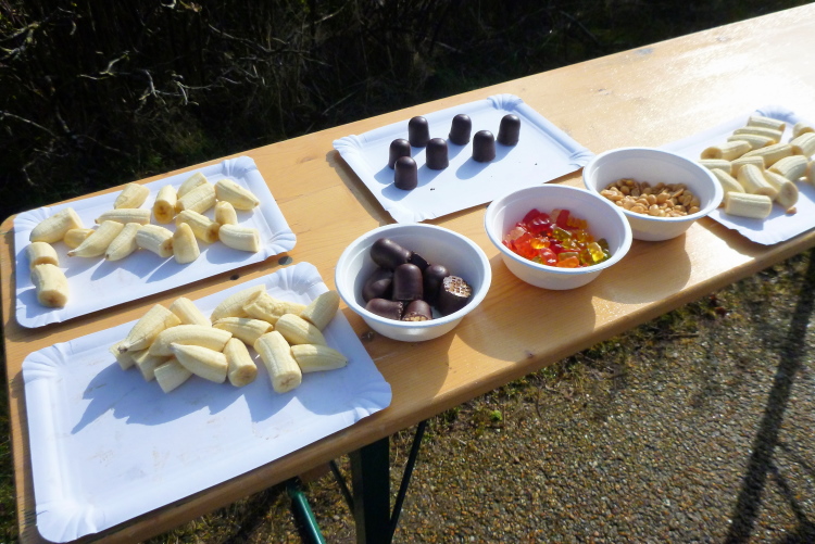 Wasser, Iso, Bananen, Haribo, Nüsse, Mohrenköpfe.