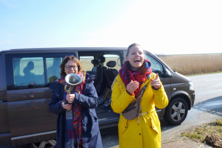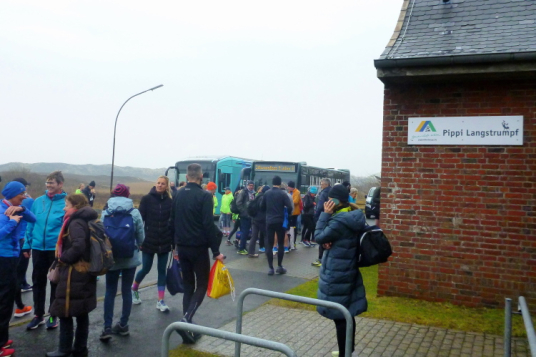 Wir haben uns mit Absicht in Hörnum, also ganz im Süden, wo das Ziel sein wird, einquartiert. Kurze Wege nach dem Lauf sind Trumpf, denken wir in unserer Einfalt. Um 8:15 Uhr bin ich am Hafen, von wo aus ein Bus den kompletten Weg nach Norden nimmt, viele weitere Busse stehen in Westerland bereit. „Moin!“ „Moin, moin!“, kommt es zurück. Oh, ist das für ein Nordlicht nicht schon gesabbelt, weil zu viel gesagt? „Na ja“, meint Heiko, unser launiger Fahrer, „das kann ja auch Stottern sein“.