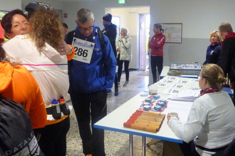 Vor dem Westerländer Congress Centrum trifft uns erst einmal der Schlag in Form einer langen Warteschlange, die sich auf der Friedrichstraße gebildet hat. Erfreulicherweise geht’s aber dann doch recht zügig voran, sodass ich meine Startunterlagen mit ein paar netten Beigaben schneller als befürchtet in der Hand halte. Ganz besonders gespannt bin ich auf das afrikanische Nudelgericht, das man uns versprochen hat. Da hätte ich wohl etwas missverstanden, signalisiert man mir. Es gäbe keine Pasta Togo, sondern Pasta to go, also zum Mitnehmen. Ah ja. Die allerdings gibt es nicht in verzehrbereiter Form, sondern trocken zum Kochen bzw. eine Soße zum Wärmen. Na gut, dann wird das eben daheim nachgeholt. Ein Gedicht sind die übriggebliebenen Medaillen der vergangenen Jahre, die man gegen eine Spende an den Mann bzw. die Frau zu bringen versucht. Tolle Stücke sind darunter, die an den einen oder anderen Liebhaber gegen klingende Münze wohl auch über den Tresen wandern.