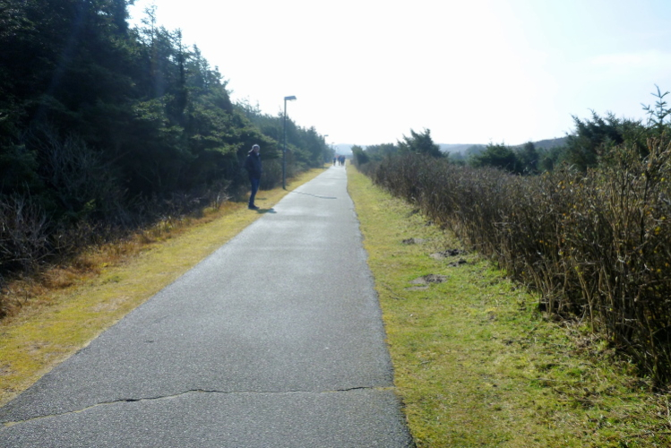 Wir verlassen Wenningstedt und nehmen Kurs auf die Inselhauptstadt Westerland. „Ich will zurück nach Westerland!“ sangen Die Ärzte, wer erinnert sich nicht. Nicht ganz überraschend nimmt die Fandichte zu. Ein kurzer, knackiger Anstieg führt uns auf die breite Seepromenade, die bei dem phantastischen Wetter trotz der frühen Jahreszeit und Vorsaison gut besucht ist und uns daher viel Aufmerksamkeit beschert. An der dicht bevölkerten Konzertmuschel haben wir bereits 18,4 km hinter uns gebracht. Bombenstimmung herrscht auch am Sylt-Aquarium. Die Unterwasserwelt erstreckt sich auf 28 individuell gestalteten Schaubecken mit rund einer Million Litern Wasser und steht natürlich auch auf unserer To-do-Liste. Wie auf einem ehemaligen Bahndamm – halt, wahrscheinlich ist das sogar die alte Trasse der einstigen Inselbahn, fällt mir gerade ein – geht der Kurs schnurgerade südwärts.