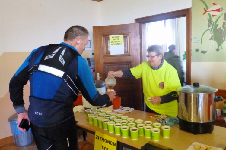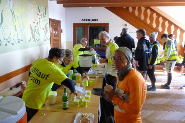 Die Zielverpflegung ist wunderbar, insbesondere von der heißen Brühe verschwinden einige Becher in meinem Schlund. Tatsächlich war der heutige Lauf 34,5 km lang und hatte damit 1,2 km Überlänge. Das kann, wie schon angedeutet, zum Problem werden, wenn man genau auf die angegebene Länge (33,333 km plus 500 m) geeicht ist, wie z.B. Marikes Freund. Der hatte, weil mit erheblichem Trainingsrückstand, eigentlich unterwegs aussteigen wollen und sich dann doch tapfer durchgebissen. Schade, wenn Du das Zeitziel um 20 Sekunden reißt, aber Regeln sind nun mal dazu da, eingehalten zu werden. So erscheint er zwar nicht in der Ergebnisliste, denn die schließt exakt nach 4:15 Std., aber wenigstens eine Medaille hat man ihm gegönnt. Leider endet hiermit Marikes und meine kurze, heftige und schweißtreibende Beziehung, zumindest ich habe sie sehr genossen. Selten habe ich einen derart kurzweiligen langen Lauf hinter mich gebracht.