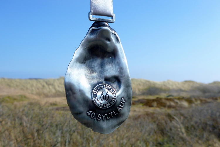 Bald darauf Tour-de-France-Gefühl: Dicht an dicht stehen die Zuschauer, kaum kann man den Weg noch erkennen, sehr schön. Unser Freund mit dem Schild steht schon parat. „Umkehren wäre jetzt auch blöd!“. Wie recht er damit doch hat. Elke schießt das ultimative Fast-zuhause-Foto, dann sehen wir das Wort Ziel und bleiben stehen. Fehler, nach links müssen wir noch abbiegen und sind wenige Meter später nach 3:24 Std. Hand in Hand im Ziel. „Danke, dass Du mich die letzten km gezogen hast!“, meint Marike in meinen Armen. „Danke, dass Du mich die vielen km davor gezogen hast“, entgegne ich, denn ohne sie (Mann will sich ja keine Blöße geben...) wäre ich sicherlich um einiges langsamer gewesen. Zur Belohnung gibt es für jeden von uns eine Sylter Royal, also eine einheimische Auster. Allerdings nicht zum Sofortverzehr, sondern zum Umhängen und Mitnehmen. Klasse, solch ein Teil habe ich noch nicht. Wieder einmal hat man sich etwas Tolles für uns einfallen lassen.