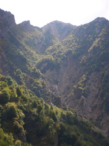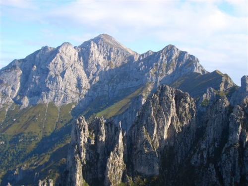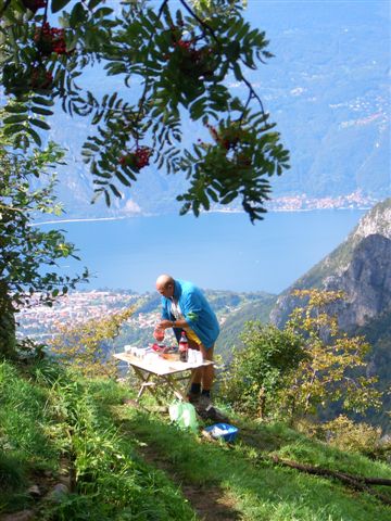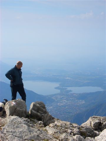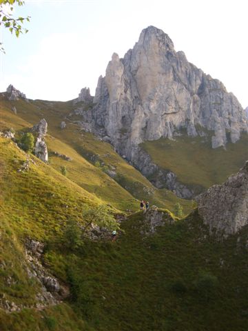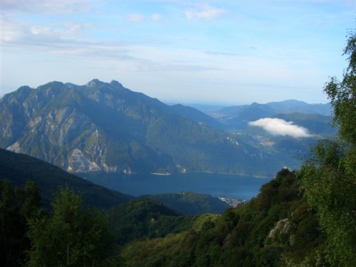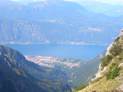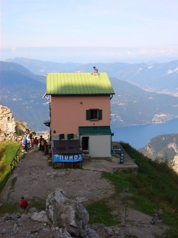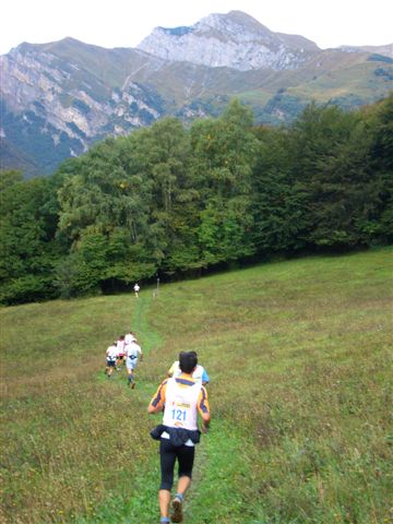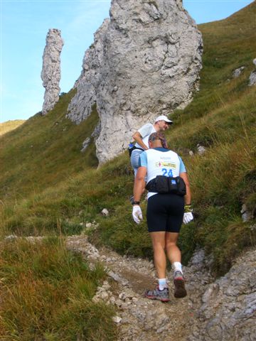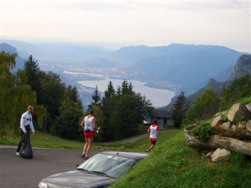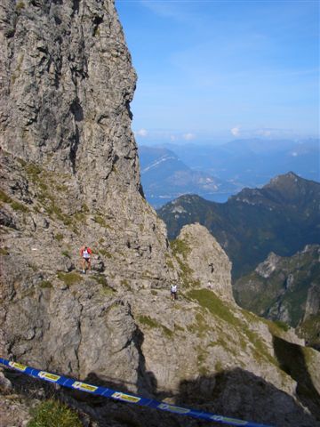 Nach dem Abstieg des Gipfels der Grignetta verläuft der Trail westseitig im Schatten des Massivs auf steilen Geröllpfaden und Wiesen hinunter zum Rifugio Elisa. Die Wege sind hier noch feucht vom Regen des Vortages. Die Steine sind schlammig und extrem rutschig. Ich gehe vorsichtig und verliere viel Zeit dabei. Aber heile Knochen sind mir lieber. Kurz nach dem Refugio an einem exponierten Ausichtsplatz hat es sich ein lustiger Helfer gemütlich gemacht, wir unterhalten uns angeregt mit Händen und Füßen, denn er kann nur italienisch, ich wiederum davon nur ein paar Brocken und er versteht keine meiner sonst angebotenen Sprachkenntnisse. Aber er brüllt mir aus voller Brust ein frohes „Vai Germania!!!“ hinterher, bedient seine Fanfare, die einen Lärm verursacht wie ein Schiffshorn und von den Felsen zurückgeworfen wird. Alle Läufer werden von ihm angefeuert, noch lange höre ich den Widerhall seines Horns in den Felsen.