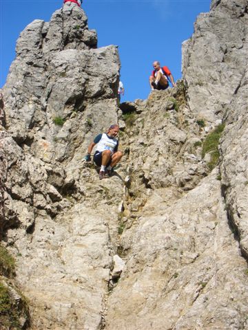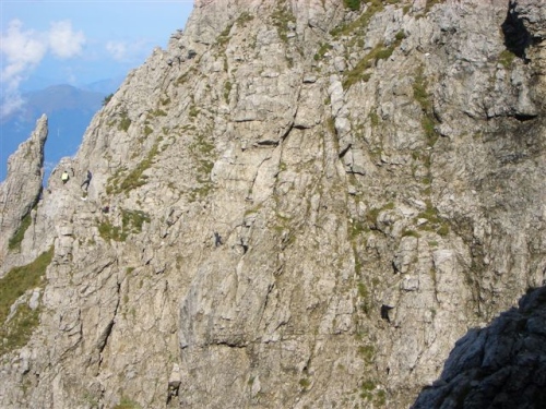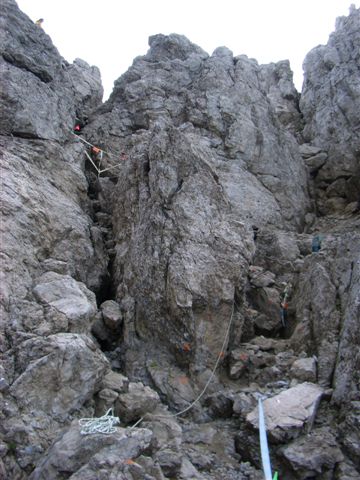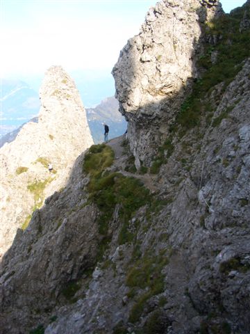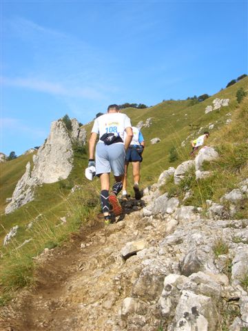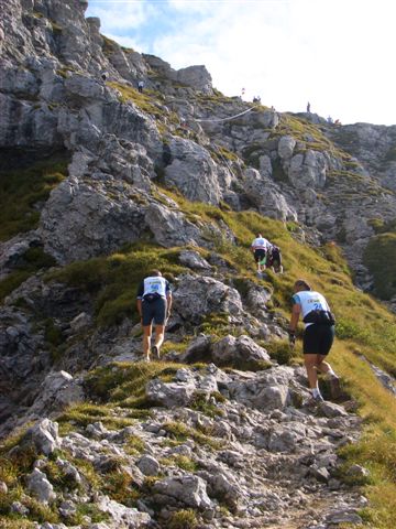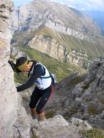 Schon bald nach der Hütte erfährt das Gewohnte eine kleine Steigerung. Seil- und kettengesicherte Passagen, die oft 10 Meter in die Höhe führen, hinunter oder den Fels queren. Ein Klettersteig der Kategorie A. Ich überlege nicht lange, ob ich heute Angst vor der Tiefe habe, allzu ausgesetzt sind die Stellen zum Glück auch nicht und die Versicherung macht einen zuverlässigen Eindruck. Hier am hinteren Ende des Läuferfeldes lässt jeder dem Vordermann Zeit, bis er die Kletterstelle überwunden hat. „Aber wie wird das wohl vorne bei den Schnellsten gegangen sein?“ frage ich mich und bin froh, nicht dazu zu gehören.