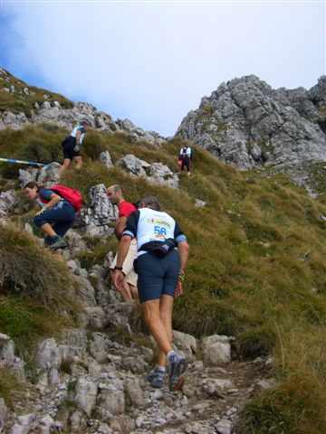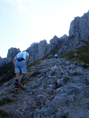 Nach diesen ersten anstrengenden Kilometern wird es flacher. Doch ganz gegen meine Gewohnheit schlage ich auch hier ein recht hohes Tempo an, denn die erste Zeitkontrolle ist nach ca. 16,5 km. Sie liegt auf 2.000 Meter kurz unter dem Gipfel des Grignetta. Bis dahin gilt es bereits die ersten Kletterstellen zu überwinden. Man muss den Punkt nach 3:30 Std. erreicht haben, sonst heißt es Startnummer abgeben. Luigi rät mir zur Eile, sonst würde ich das erste Zeitlimit nicht einhalten. Weitere Kontrollpunkte sind beim Rifugio Bogani, nach 6:15 Stunden und beim Rifugio Pialeral nach 8:30. „Aber das schaffst du dann locker, nur die erste Kontrolle ist etwas eng“ meinte er schmunzelnd.