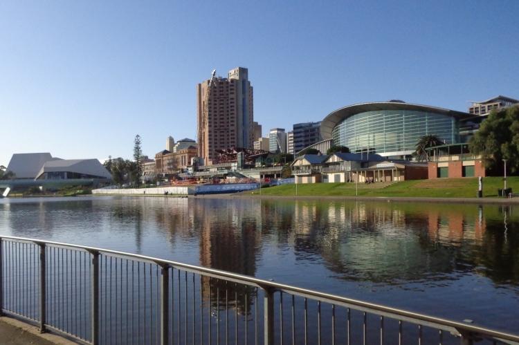 Stockdunkel ist es, als ich um 6h früh vor das Hotel trete. Es liegt am Beginn der Ausgehmeile. Jede Menge Taxis sind dabei, die Nachtschwärmer aufzusammeln. Weg von der Hindley Street ist es beinahe gespenstisch ruhig. Am erleuchteten Adelaide Convention Center vorbei überquere ich den River Torrens, der hier eher wie ein kleiner Stausee aussieht. Vom linken Ufer her spiegelt sich die Schokoladeseite der Stadt im Fluss, die Riverbank. Dieses Motiv wird immer gezeigt, wenn im Fernsehen über Neuigkeiten aus Adelaide berichtet wird.