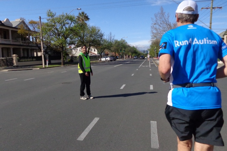 „Drink Stop Ahead“ und Anstieg ab km8: Northern Adelaide, die bessere Wohngegend hier. Die Strecke oben ist winkelig, fast an jeder Kreuzung und Kurve steht ein Streckenposten mit Slow/Stop-Schild, je nach Seite. Ganz schön personalintensiv dieser Marathon. Und fast an jeder Abzweigung ändern sich die Anforderungen: es geht rauf, rechts, runter, links, wieder rauf… Km 11, ein ausgebranntes Auto steht am Straßenrand, das passt so gar nicht zu der Gegend.