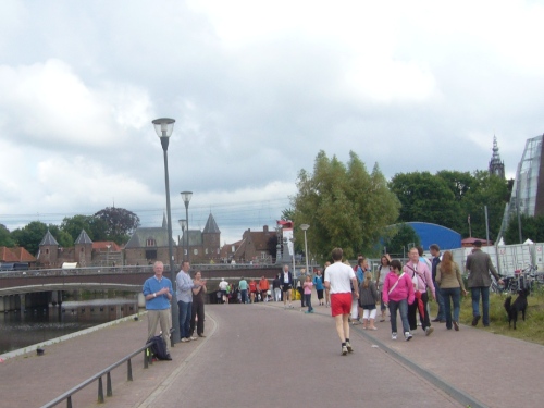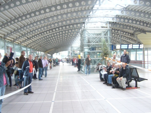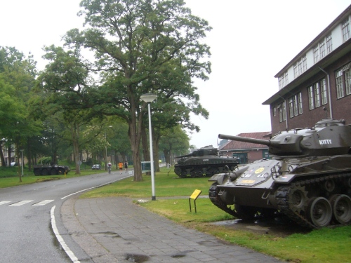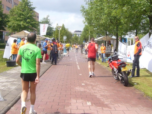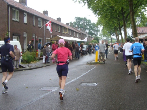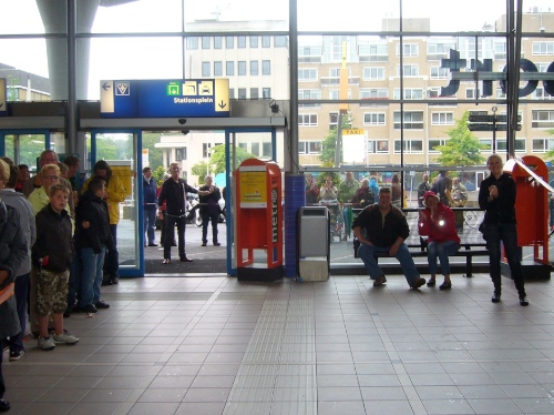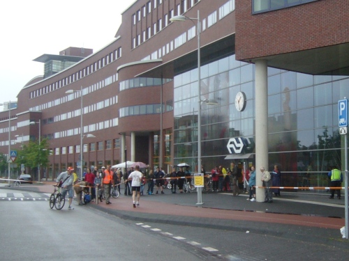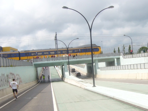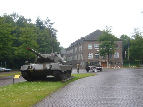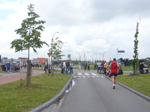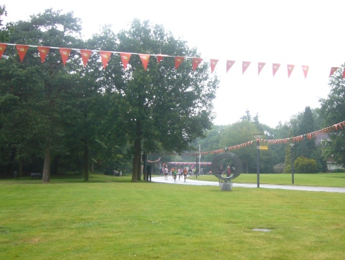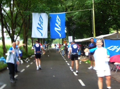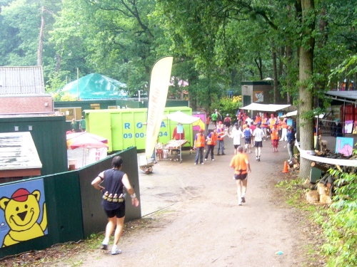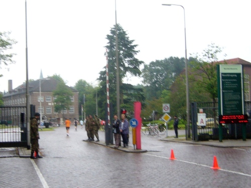 Kurz vor km 14 erreichten wir eine weitere Getränkestation mit Lifemusik. Kurz danach bogen wir in die Halle des Central Bahnhofs von Amersfoort. Über eine Treppe erreichten wir die Bahnhofshalle (Vorsicht, glatte Fliesen), die wir auf der Gegenseite wieder verließen, um nach einem weiteren Wohngebiet die Bernhard Kaserne (km 15,5). Es ging quer durch die Kaserne, vorbei an historischen Panzern zum nächsten Versorgungspunkt, den das niederländische Militär übernommen hatte. Zwei Kilometer ging es dann sehr anspruchsvoll über den Truppenübungsplatz.