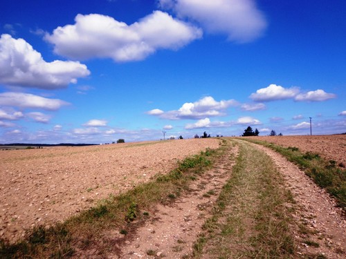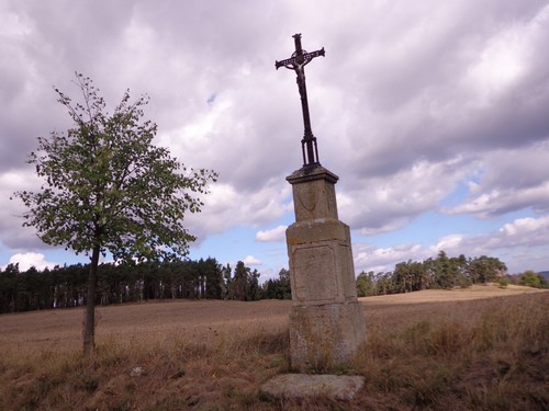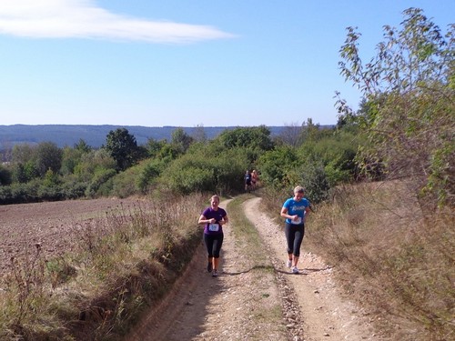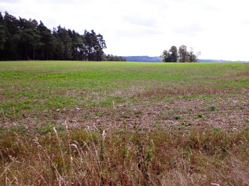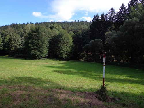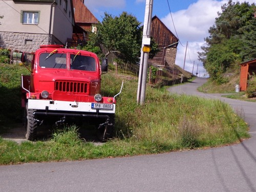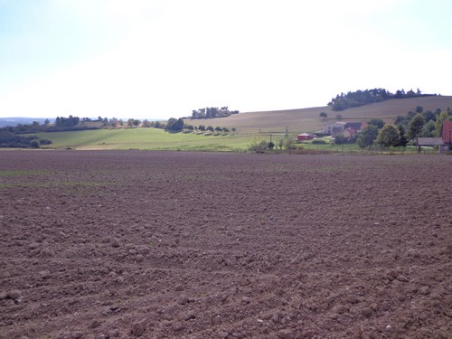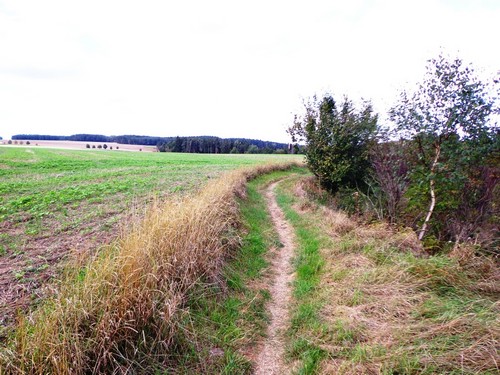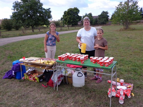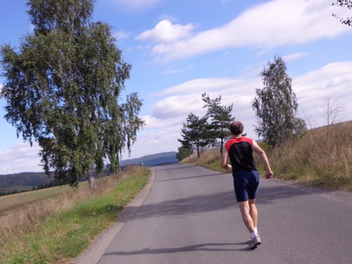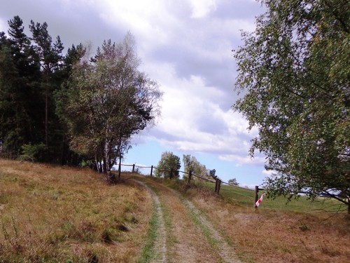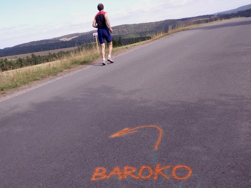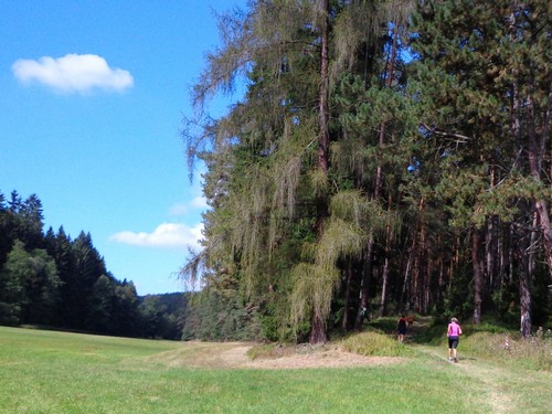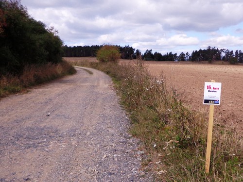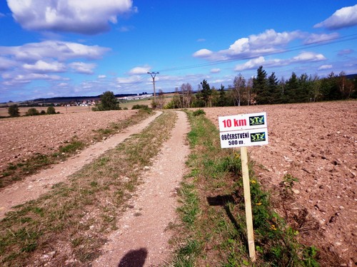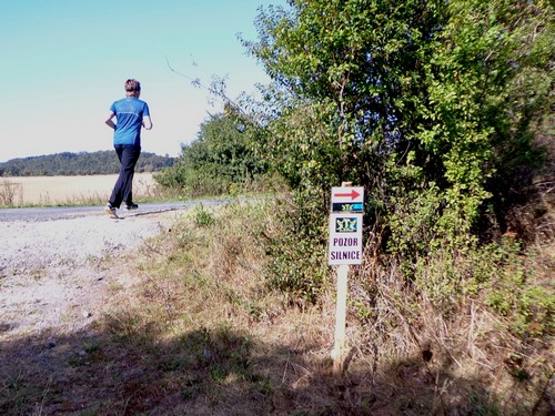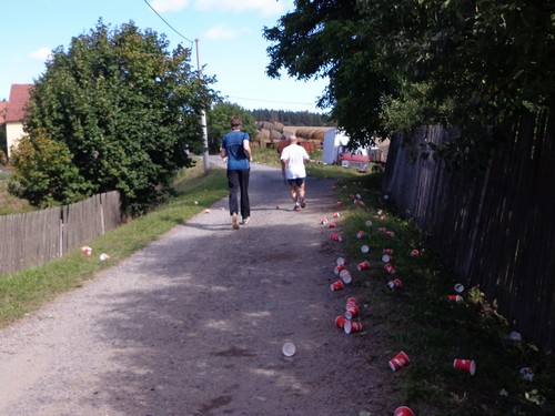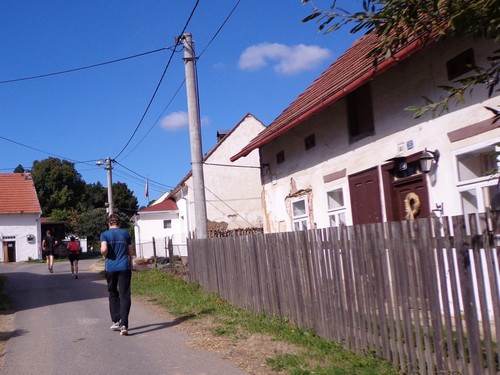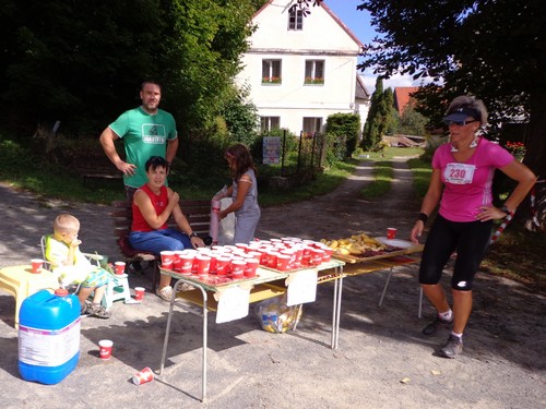 Zwei Mädchen kommen mir mit lila Startnummern entgegen, die haben ihre Abzweigung versäumt und haben heute sogar zwei zusätzliche km. Wir kommen aus dem Wald raus und haben für ein paar Meter eine asphaltierte Straße, bevor wir in einen Feldweg einbiegen. Faustgroße Steine liegen da lose rum. Damit habe ich keine Freude. Im Dorf Vrážné gibt es nach roten 6km die erste Občerstvení: Wasser und aufgeschnittene Äpfel. Ein paar Einwohner schauen drein, als würden sie bei einem Leichenzug zusehen. Von Enthusiasmus kann keine Rede sein.