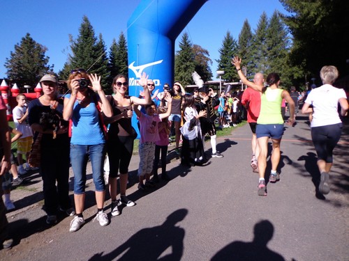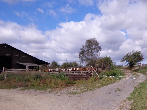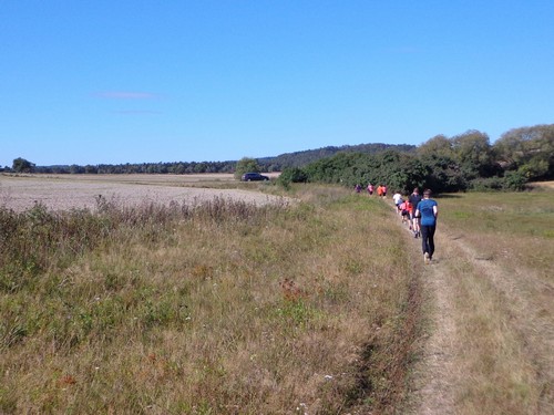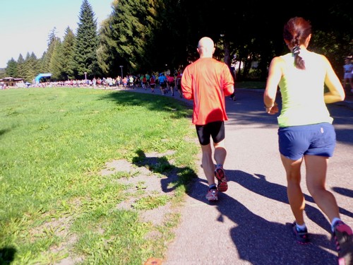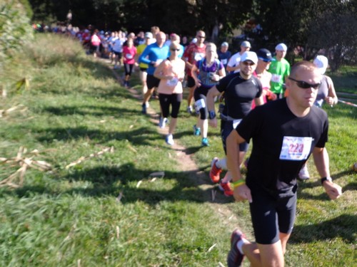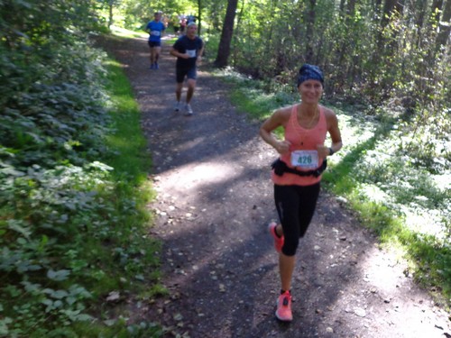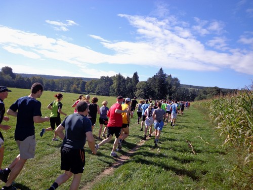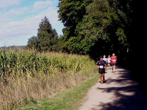 10.02 Uhr Start; Mike und Monika starten weit vorne, ich ziemlich weit hinten. Ich orientiere mich an den Startnummern der anderen und biege nach 100m links ab in die große Startschleife. An einem Maisfeld entlang, durch ein Wäldchen in einem großen Bogen über die große Wiese und nochmals am Start vorbei. Hier werden wir angefeuert. Dieses Anfeuern wird ziemlich einzigartig bleiben.