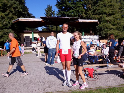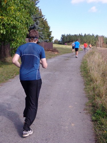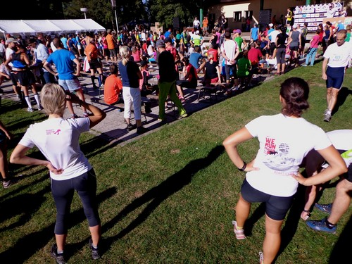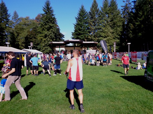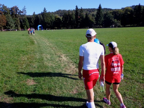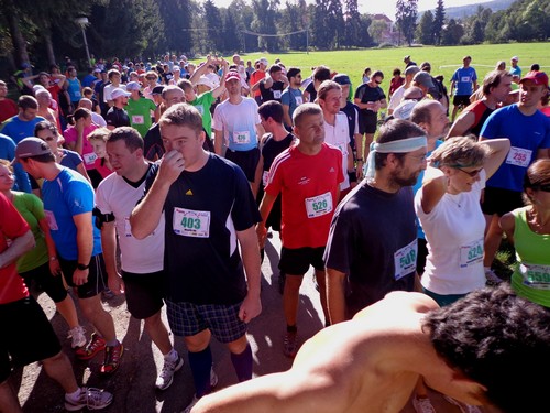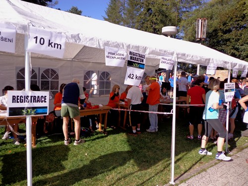 Kurz vor 10h werden die Teilnehmer auf tschechisch über allerlei Details informiert. An mir prallt das ab. Im Anschluss gibt es aber auch ein Briefing auf Englisch, das wesentlich kürzer ist. Die 10km-Leute sollen nach dem Start gleich geradeaus laufen, die Halbmarathonis erst eine 1km lange Runde auf der großen Wiese laufen, bevor sie nochmals am Start vorbeikommen und es in die Landschaft geht. Von den Marathonis wird nichts erwähnt. Hm. Ich werde mich an meine Mitbewerber halten. Aufgrund der Farbe der Startnummer kann man erkennen, in welchem Bewerb jemand läuft. Rot ist Marathon, Halbmarathon heißt, die Zahlen sind grün und 10km mit lila Zahlen. Hannes, der noch an einem Muskelfaserriss im Oberschenkel laboriert, wird sich heute mit 4,2km begnügen. Für den Halbmarathon hat ihm seine Ärztin keine Starterlaubnis erteilt.