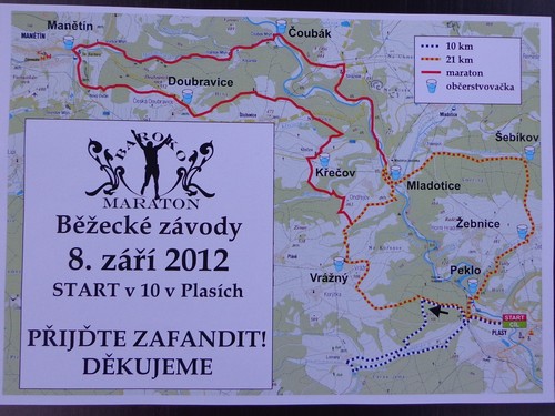 „Der Internationale Barock-Marathon ist für jeden, der gerne läuft und das Tal des Flusses Střela sowie die romantische Umgebung genießen will.“ Keine Tempobolzerei also. Genießen stehe im Vordergrund, da fühle ich mich angesprochen. Und: „Kommen Sie und verbringen Sie einen schönen Tag in einer einmaligen Atmosphäre der malerischen Stadt Plasy in Westböhmen!“