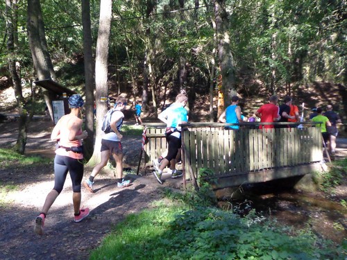 In Křečov gibt es nach gut 10km wieder etwas zu essen und trinken, die Helfer lassen sich gerne fotografieren. Eine Dame in Pink macht sich gerade auf den weiteren Weg und verschwindet im Wald.
